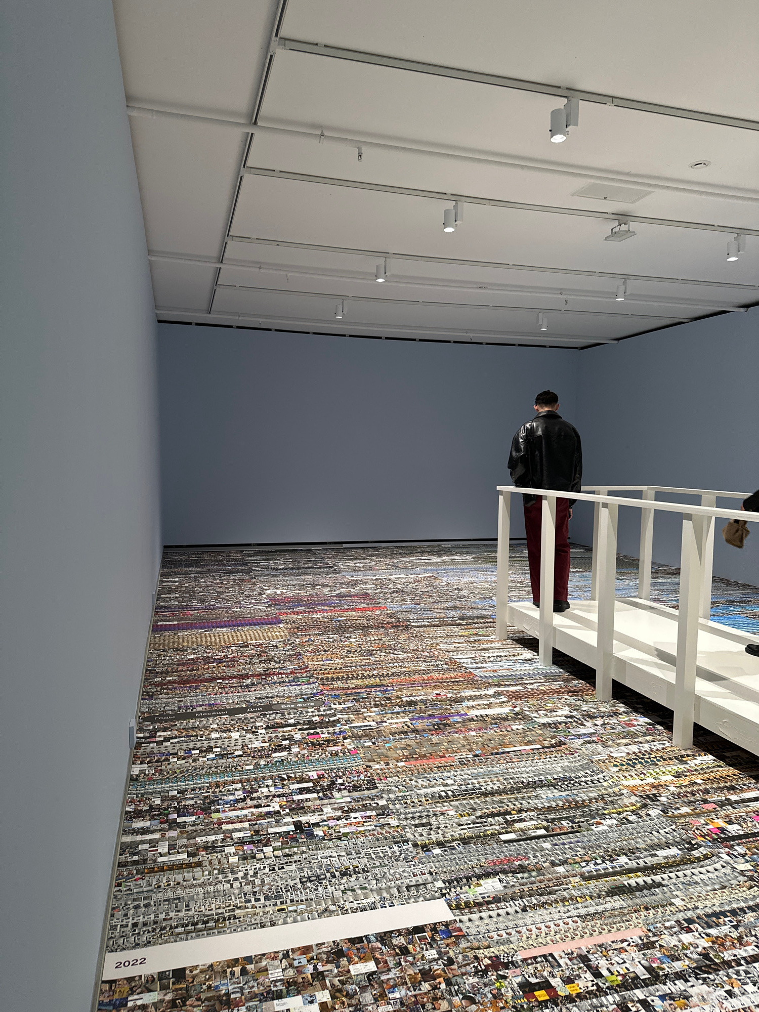The image depicts an indoor art gallery space. A tall wall is covered with numerous small photos arranged in rows and columns, creating a mosaic effect. A person, presumably an art viewer, stands on a…read more