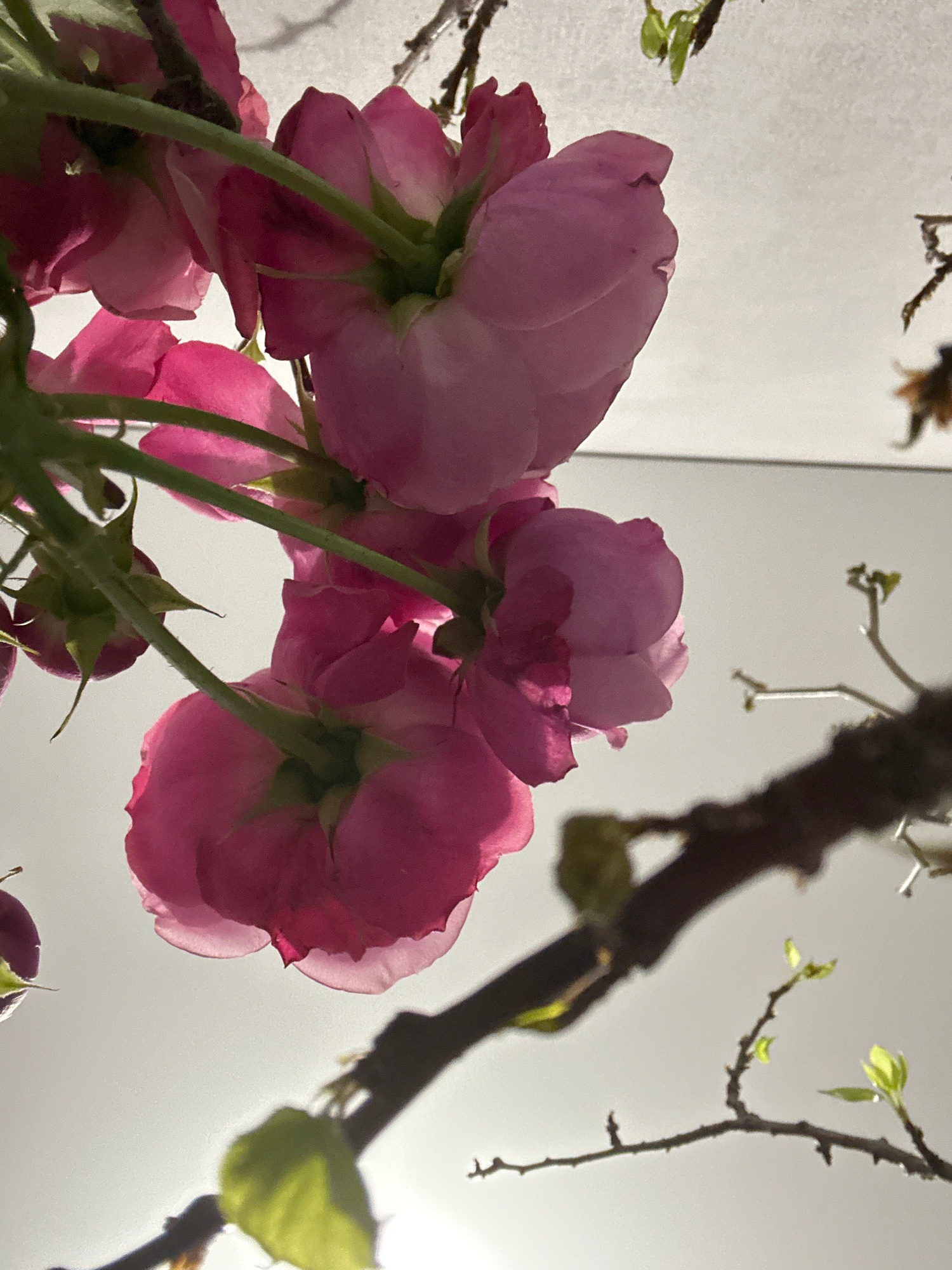 The image shows a low-angle shot of pink flowers, possibly roses, with green stems. A dark, blurred branch with small green leaves is in the background. The background also includes a white wall or su…read more