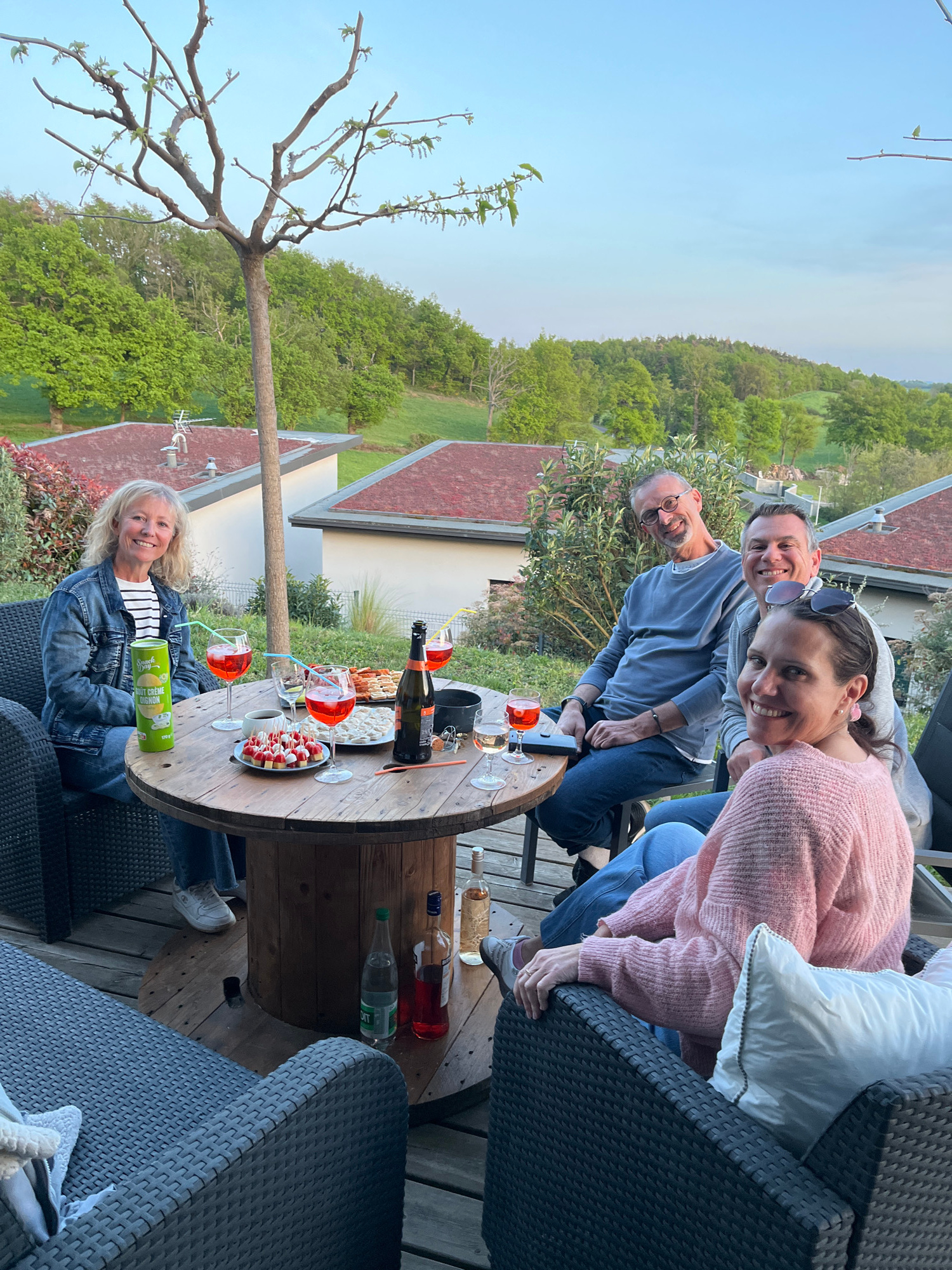 The image captures a social gathering on a wooden deck, likely a patio, in Chambœuf, France, based on the presence of typical French architectural styles in the background. Five individuals are visibl…read more