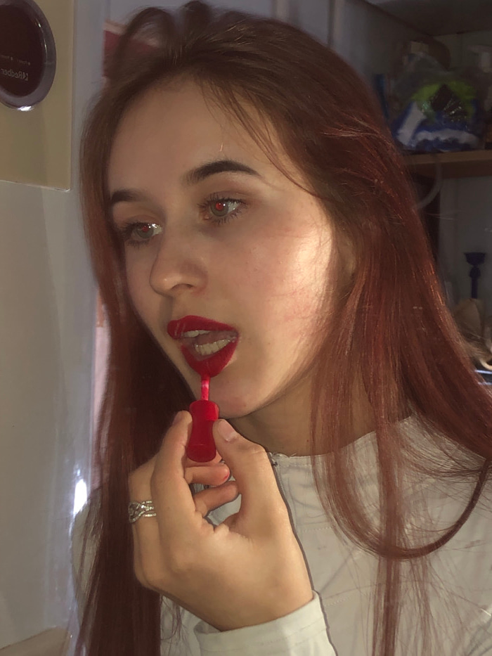 The image, oriented horizontally as if the camera was turned 90 degrees counter-clockwise, features a young individual with long, reddish-brown hair and fair skin. The person's face is centered in the…read more