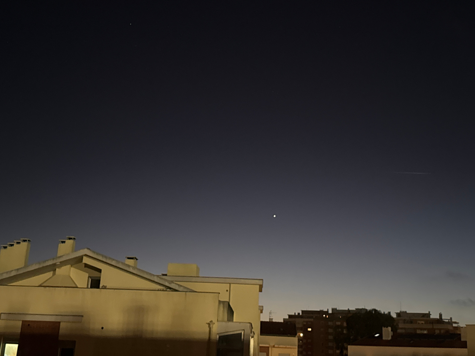 The image depicts a night scene in Figueira da Foz, Portugal. The sky is a dark blue gradient, transitioning to a lighter shade near the horizon. Several stars are visible, including a bright, isolate…read more