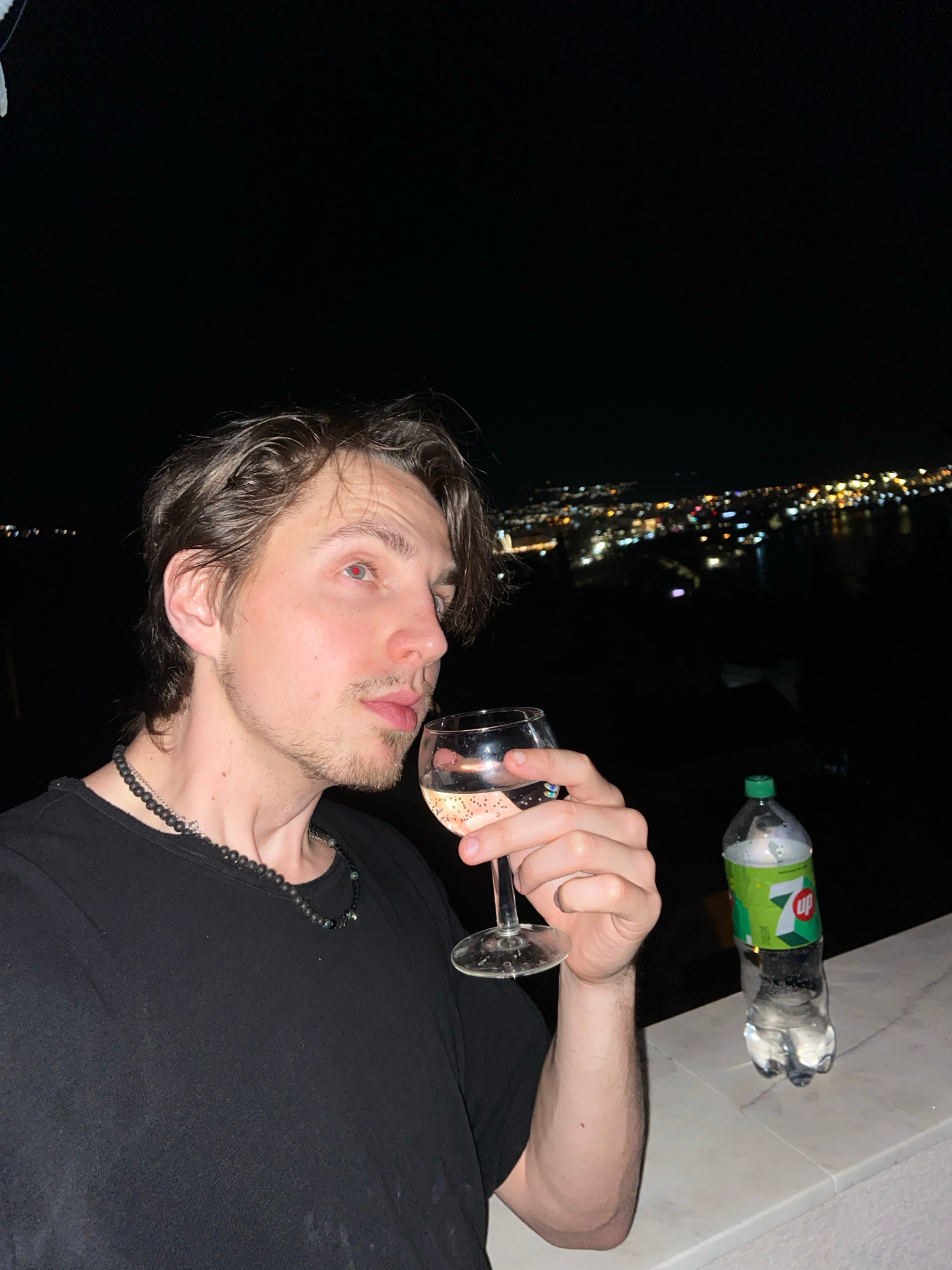 A young man is drinking from a wine glass outside at night, with the city lights of Šušanj, Montenegro, visible in the background. The man has medium-length brown hair and a goatee, and he's wearing a…read more