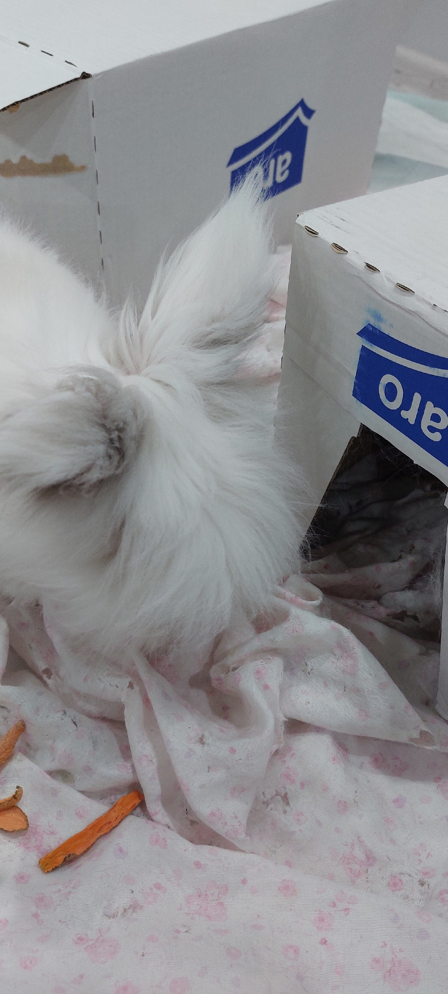 The image captures a fluffy white animal, likely a rabbit, resting within a makeshift enclosure. The animal's back and tail end are visible, covered in thick, soft white fur, with a slightly darker pa…read more