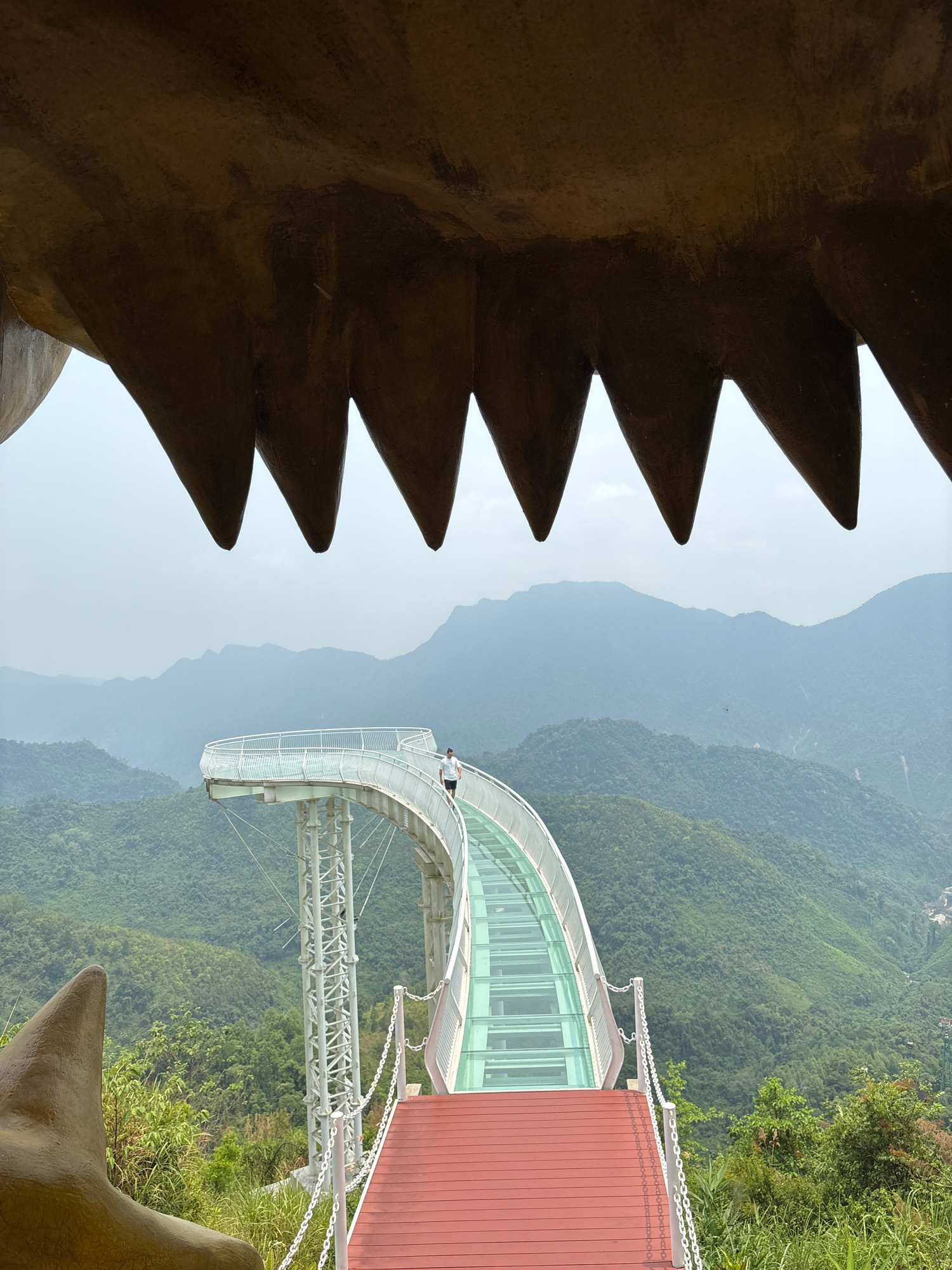 The image shows a view from inside a structure with jagged edges, possibly representing teeth, overlooking a mountainous landscape in Đà Nẵng, Vietnam. A curved glass-enclosed walkway is visible, exte…read more