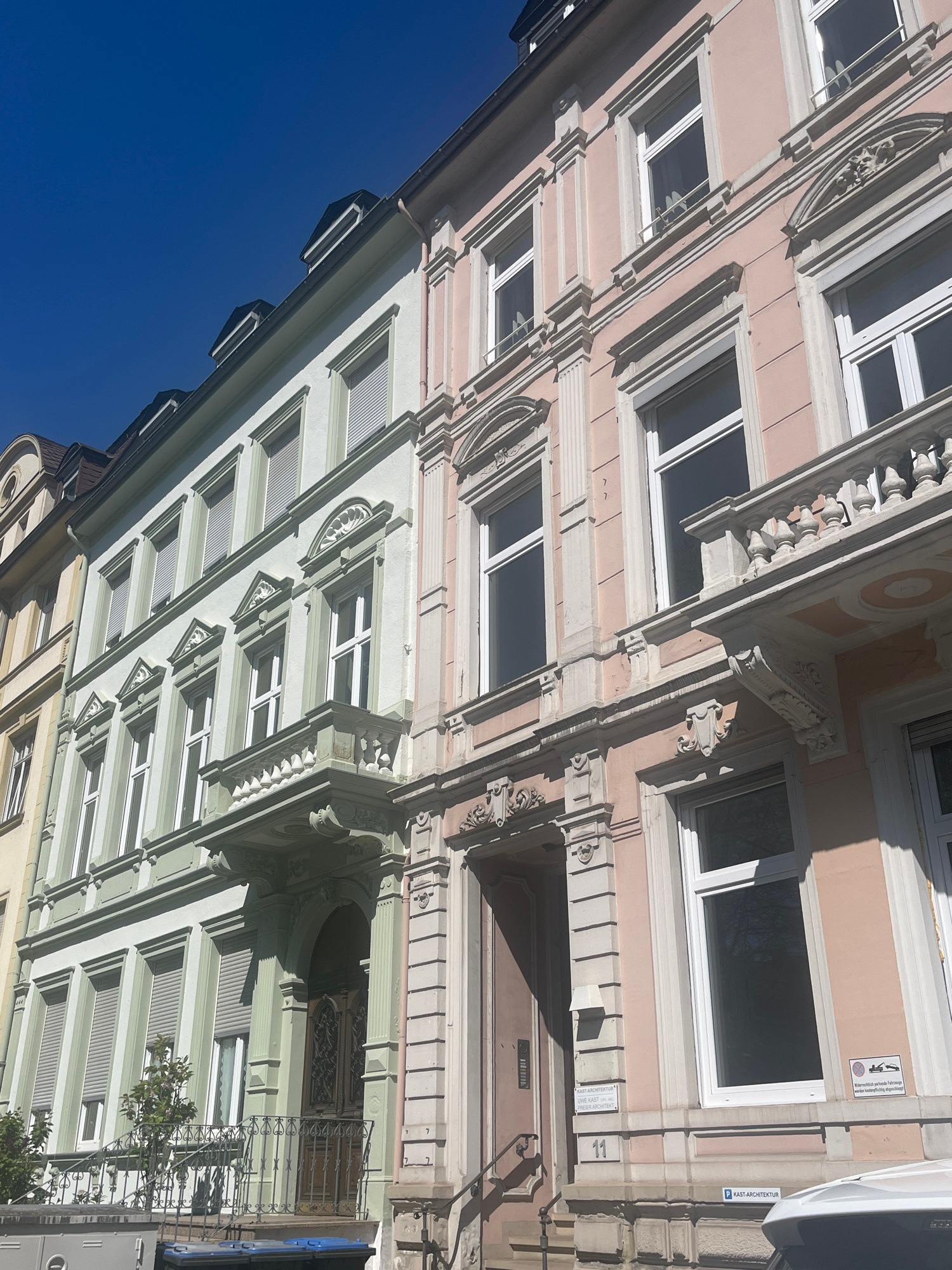 The image captures a vertical view of two adjacent buildings in Trier, Germany. The architectural style is ornate with classical details. The building on the left is painted a pale green, while the bu…read more