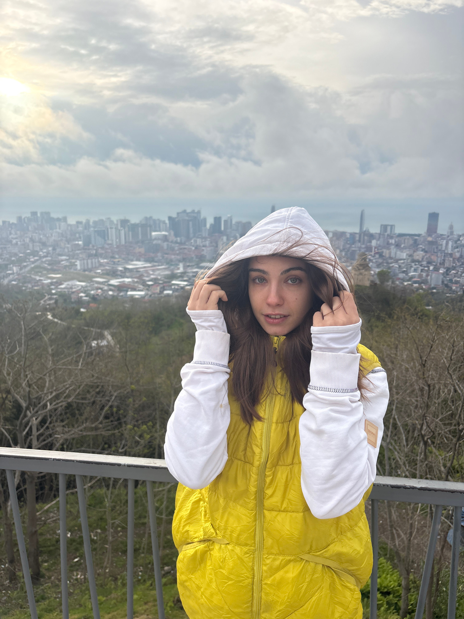 A young woman is the central subject of this outdoor, eye-level portrait. She is positioned slightly to the right of the frame's center, looking directly at the viewer with a soft smile. She has long,…read more
