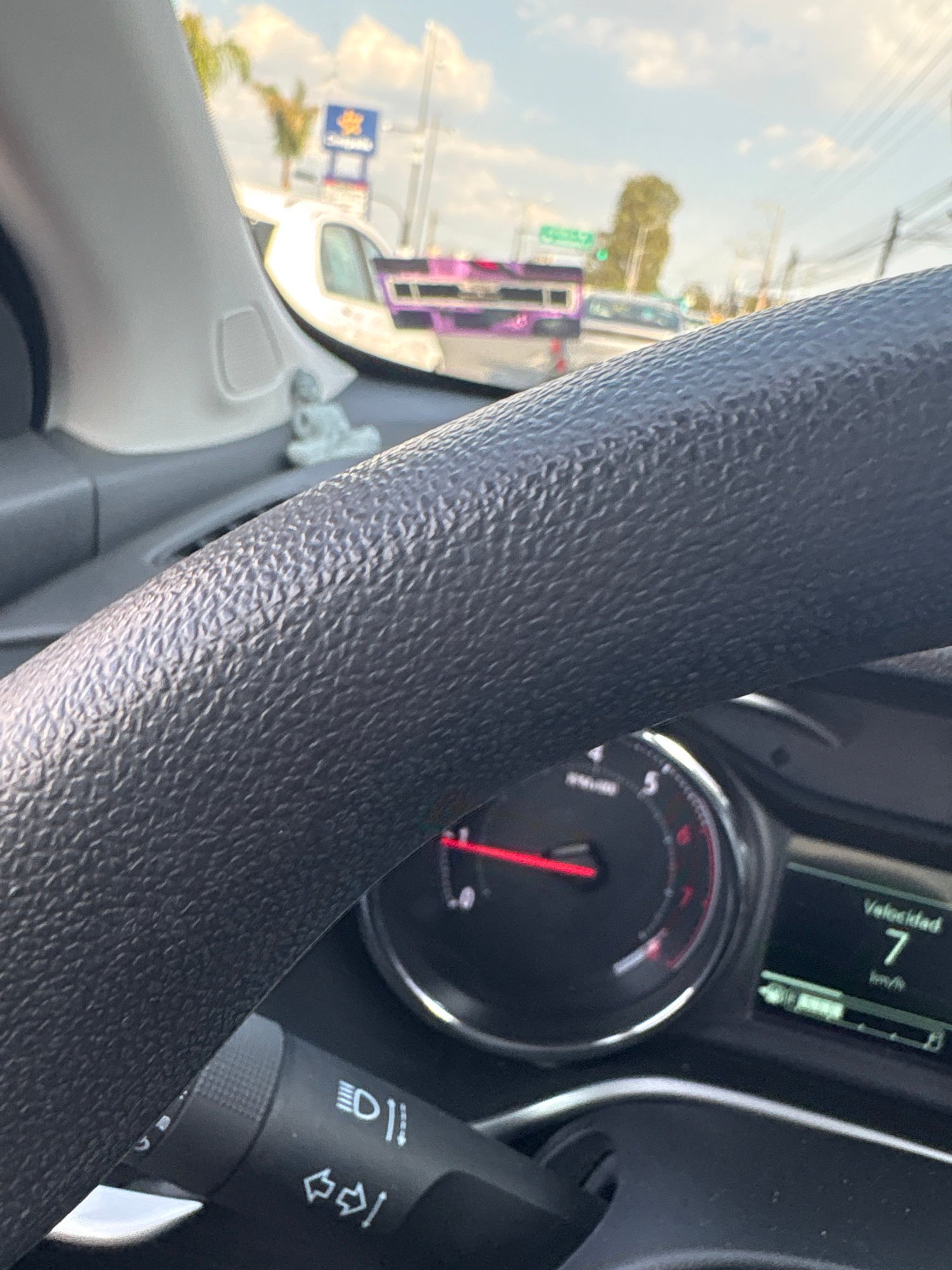 The image depicts the interior of a car, specifically the steering wheel and dashboard. The speedometer indicates the car is moving at 7 km/h. Through the windshield, a blurry view of a city street is…read more