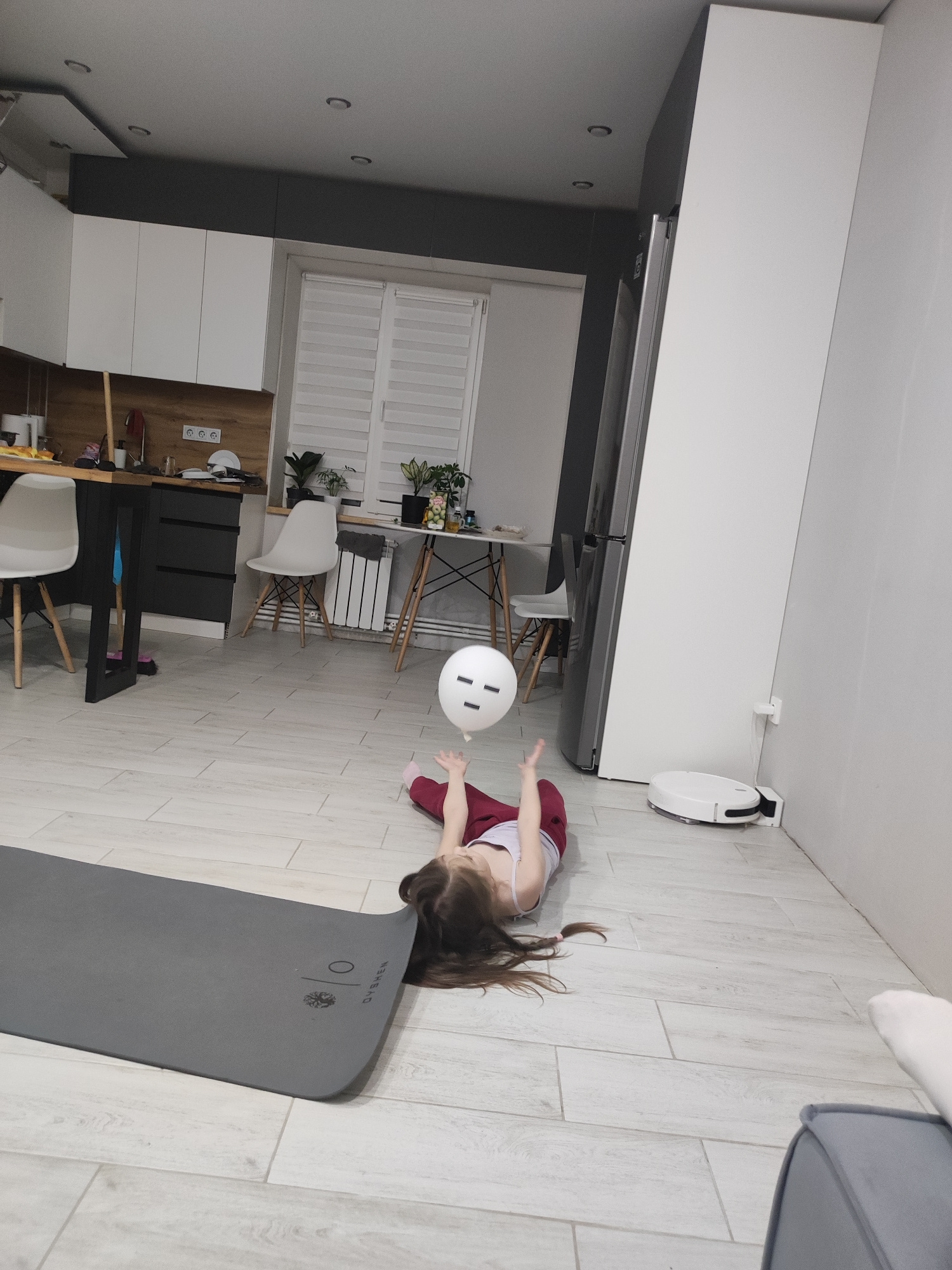 This indoor photograph captures a modern apartment's open-plan kitchen and living area in Votkinsk, Russia. A young child with long brown hair, wearing a white top and maroon pants, lies on their back…read more