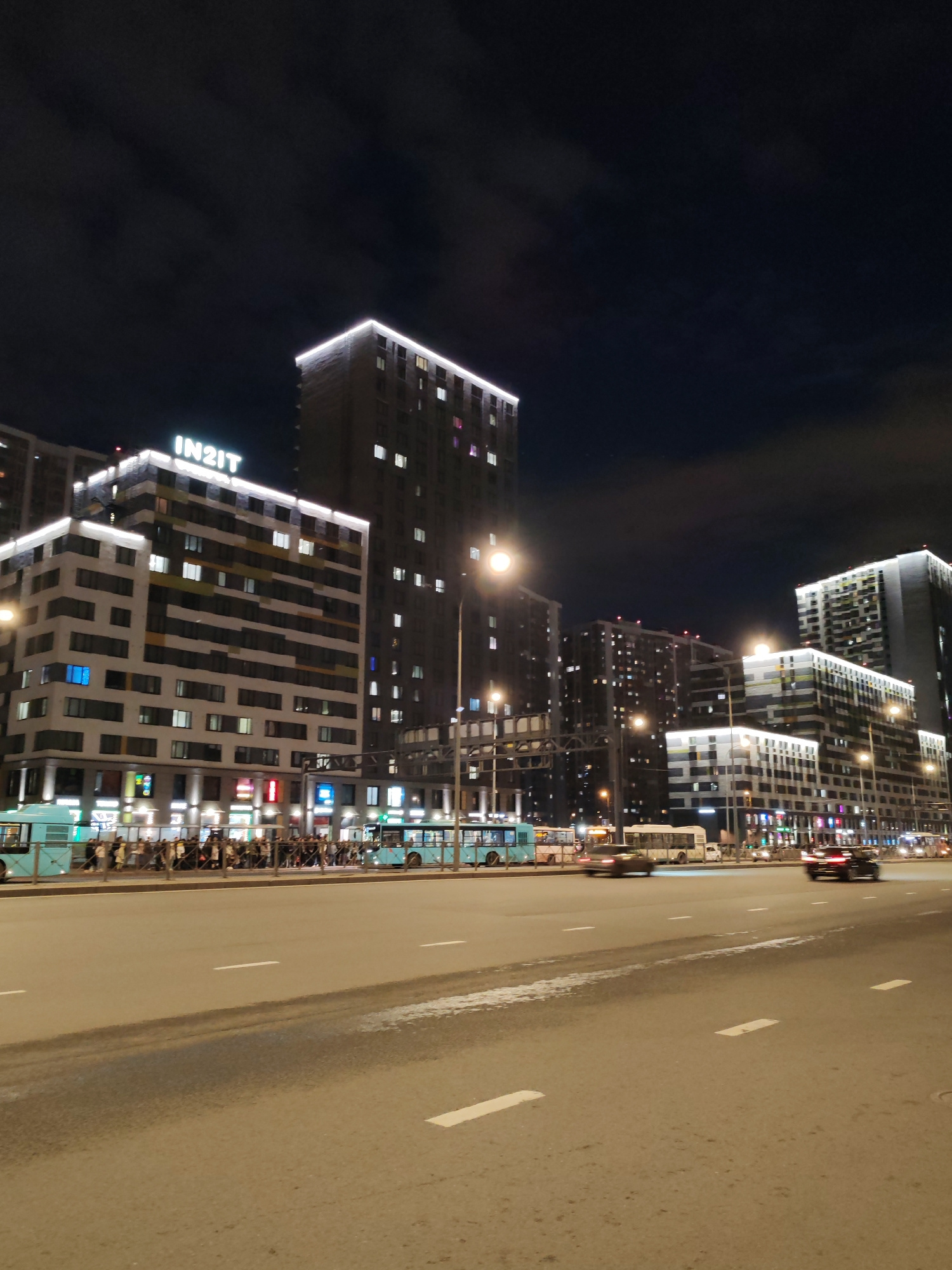 The image captures a dynamic urban street scene at night in Saint Petersburg, Russia. Modern, multi-story buildings with distinct architectural features and numerous illuminated windows dominate the b…read more