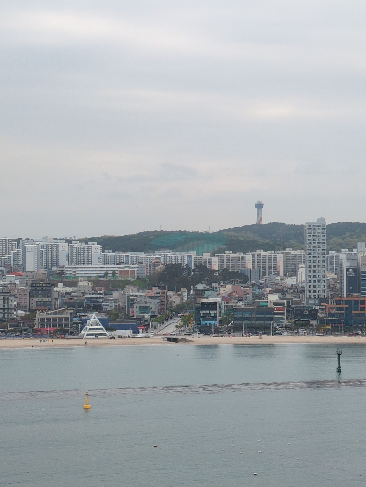 This wide panoramic shot captures a coastal city under an overcast sky. The scene is dominated by three horizontal bands: the sky, the city and its natural backdrop, and the sea with a sandy beach. T…read more