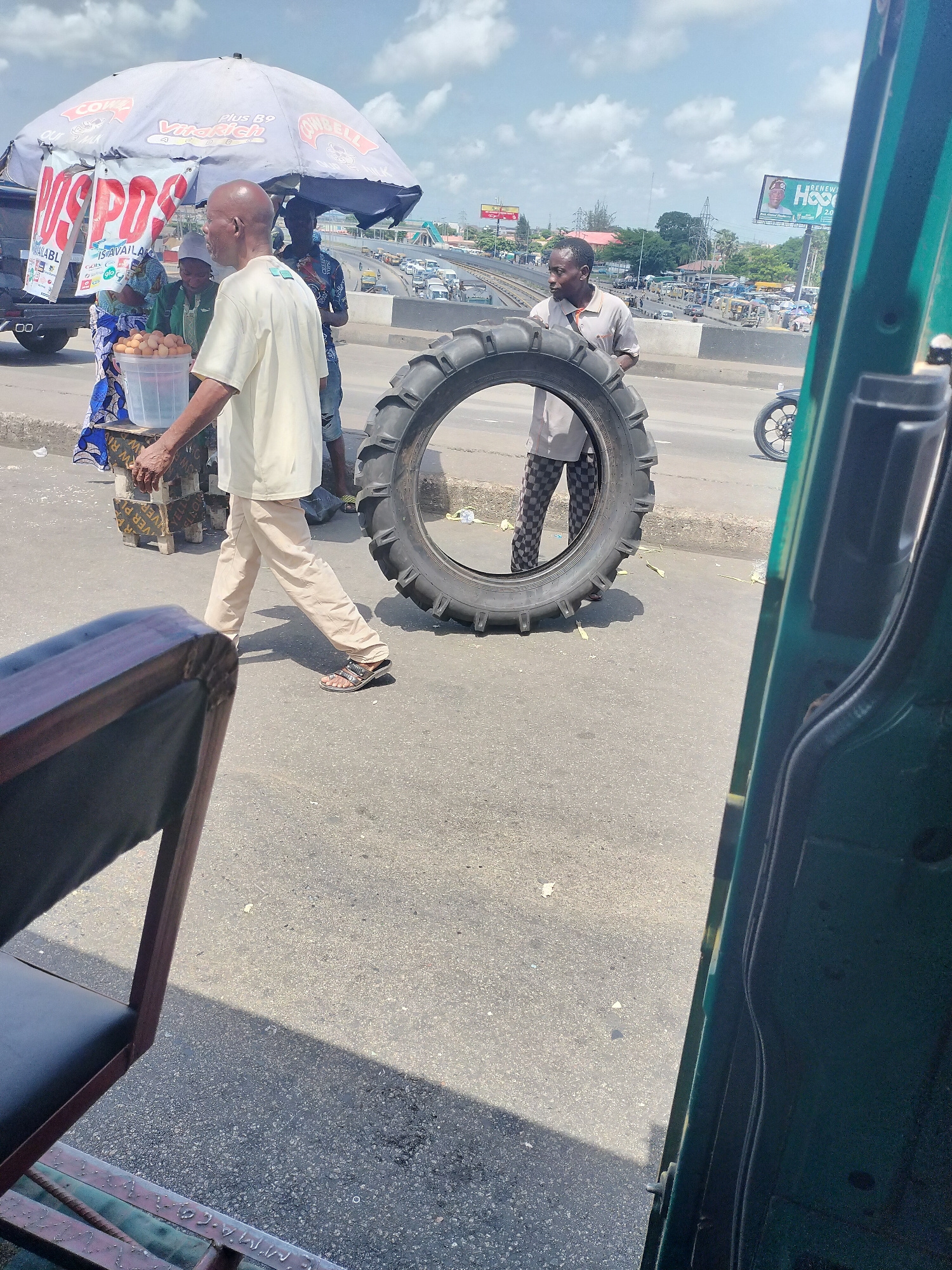 The image captures a vibrant, sunlit street scene in Lagos, Nigeria, bustling with activity. In the foreground, a man in a cream-colored shirt walks towards the left, passing a roadside vendor. This v…read more