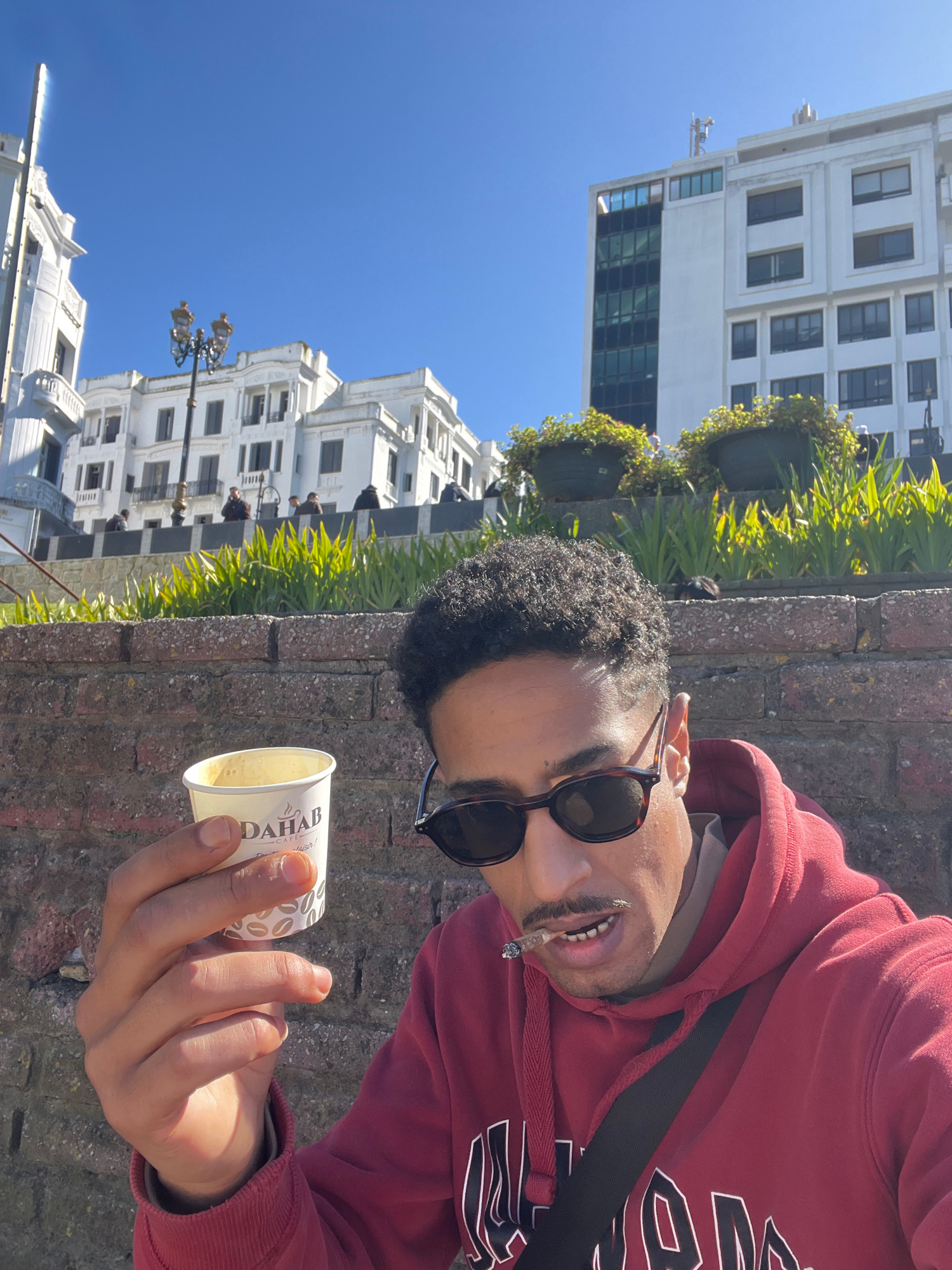 The image depicts an outdoor scene in the city of Tanger, Morocco, under a clear blue sky. In the foreground, a man takes a selfie, looking directly at the camera. He has short, curly dark hair, a mus…read more