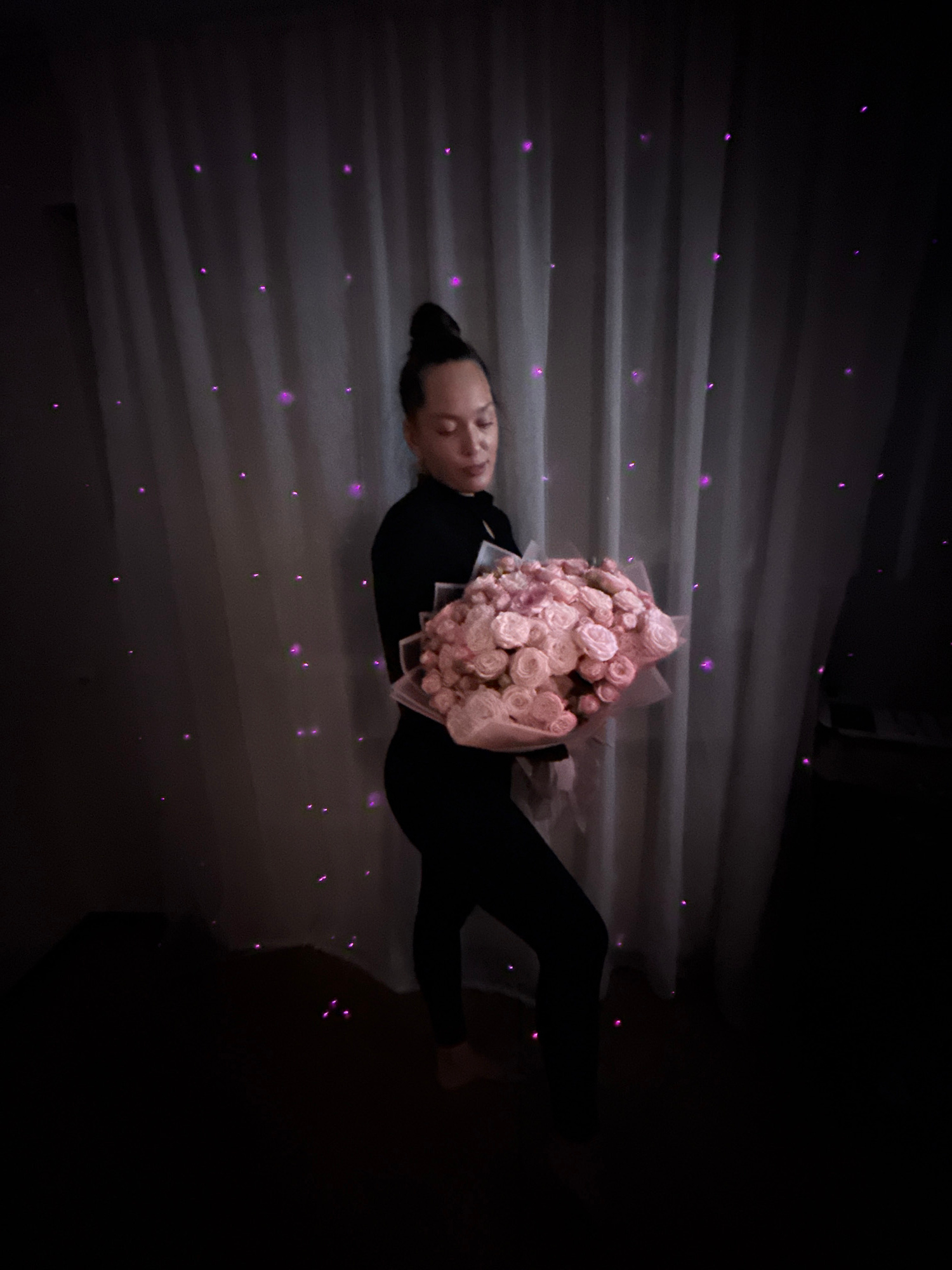 A woman lies on her back, holding a bouquet of pink roses. She is dressed in black and has her hair pulled back in a bun. The background is a dark room with what appear to be strings of lights, possib…read more