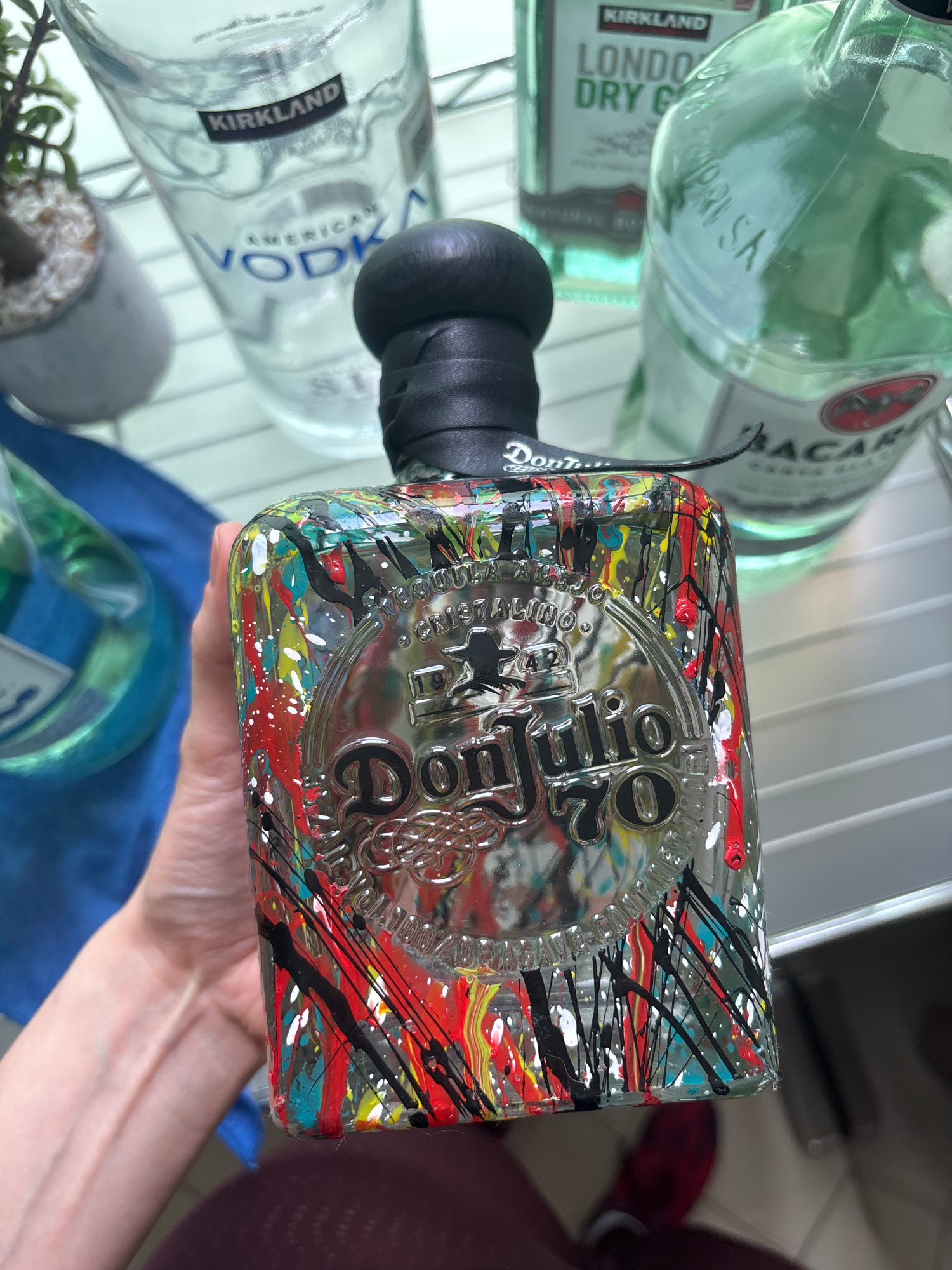 A hand holds a bottle of Don Julio 70 Cristalino tequila. The bottle has colorful paint splatters on the outside. Behind the bottle, other liquor bottles, including Kirkland Vodka, Kirkland London Dry…read more
