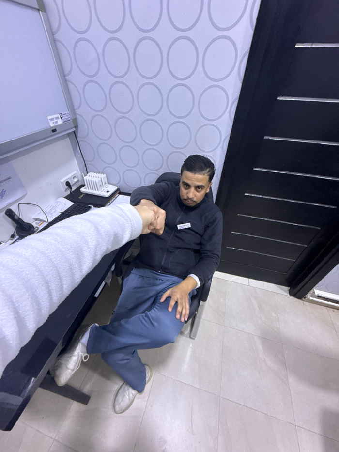 The scene depicts an indoor setting, likely an office or medical examination room, located in the city of Meknes, Morocco. The walls feature a light-colored wallpaper adorned with a repetitive pattern…read more