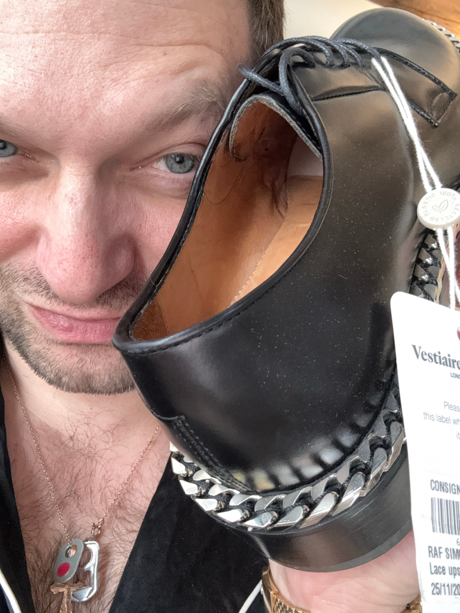 An upward-angled close-up image depicts a male subject holding a black leather dress shoe with attached tags. The subject's face occupies the left and upper-left portions of the frame, with his left e…read more