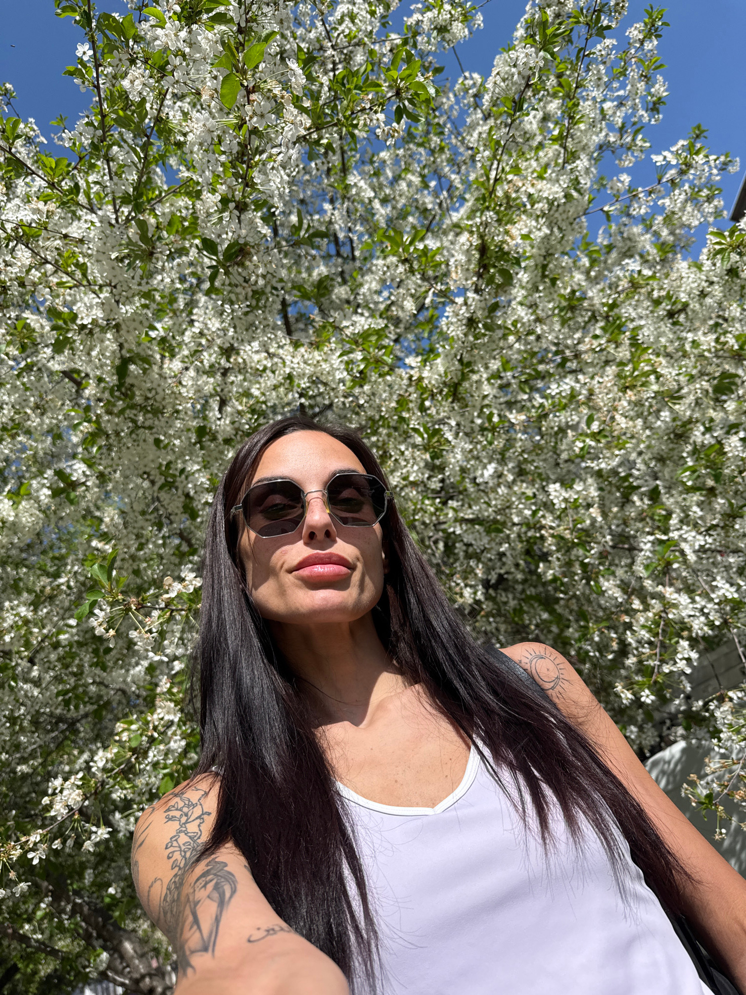 A woman with long, dark hair and sunglasses is captured in a brightly lit outdoor setting. She is wearing a white tank top and has visible tattoos on both arms. One tattoo on her left upper arm depict…read more