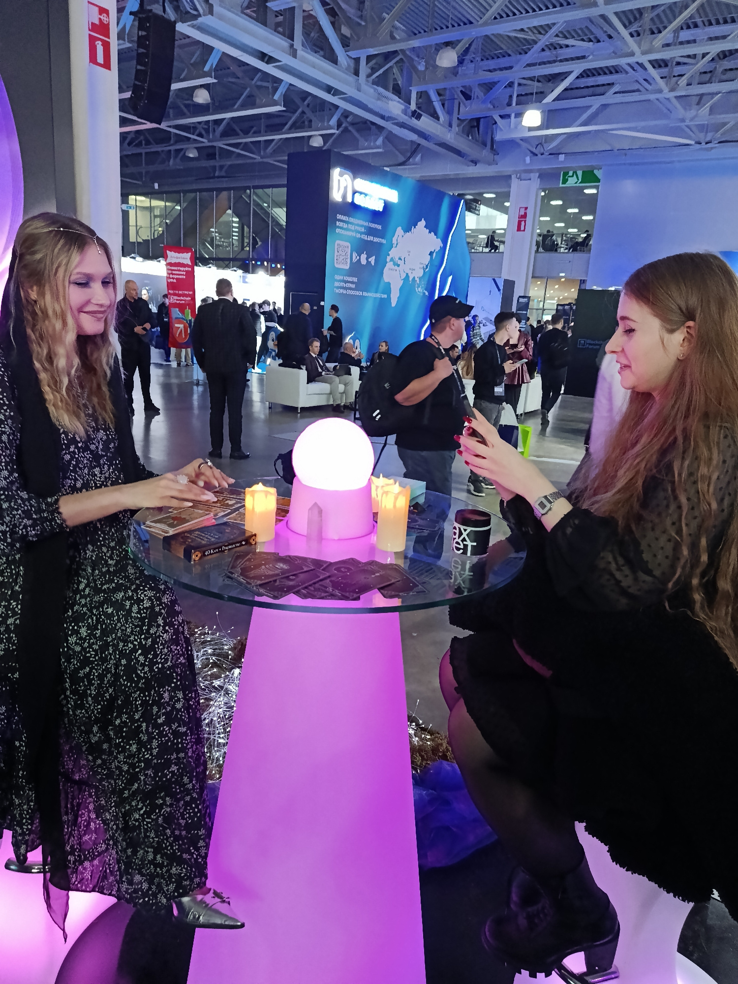 The image captures a scene from an event, possibly a convention or trade show, taking place indoors in Khimki, Russia. Two women are the central figures, seated at a round glass table supported by a n…read more