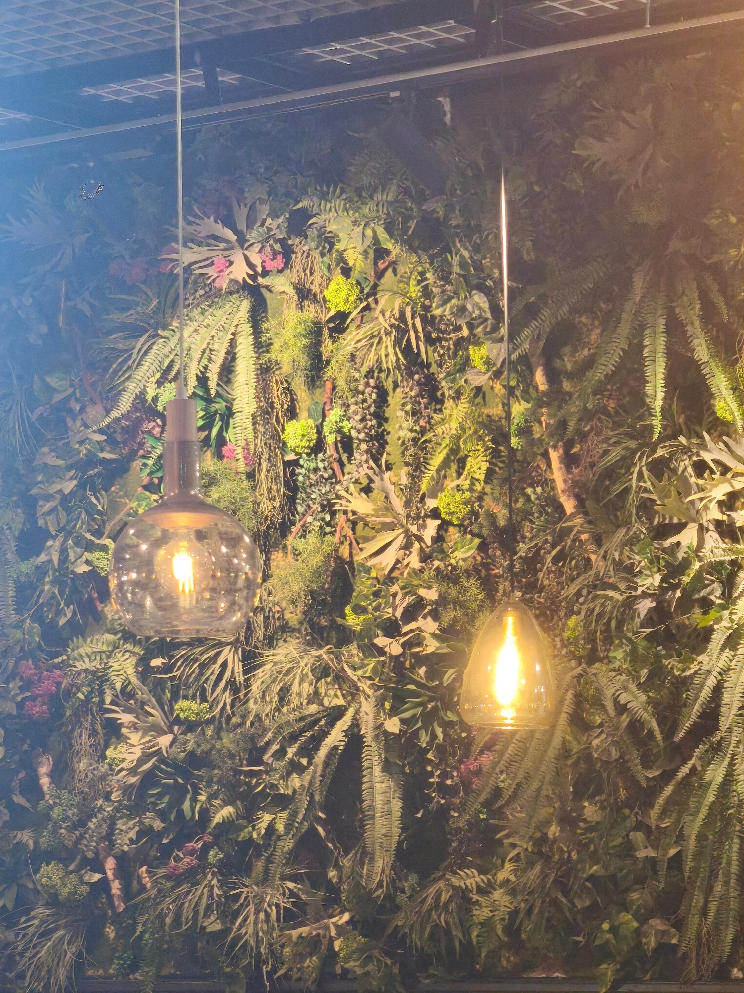 The image captures a vibrant, lush vertical garden forming a prominent backdrop, likely in an indoor commercial setting such as a cafe or restaurant in Almaty, Kazakhstan. Two decorative pendant light…read more