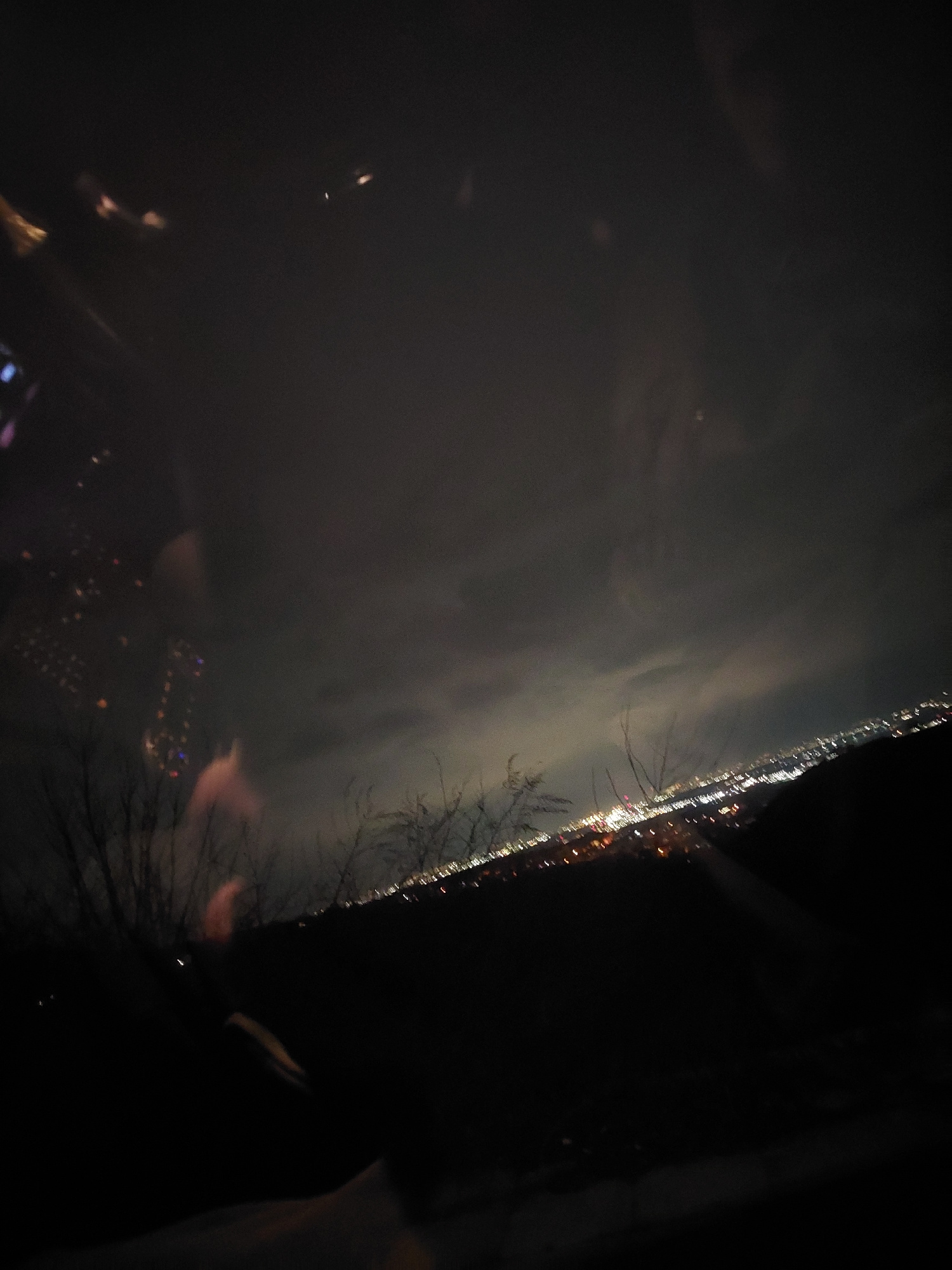 A long, blurry shot of Asenovgrad, Bulgaria at night, taken from above. The lights of the city are visible, and a tree is in the foreground on the right. The sky is dark and cloudy.