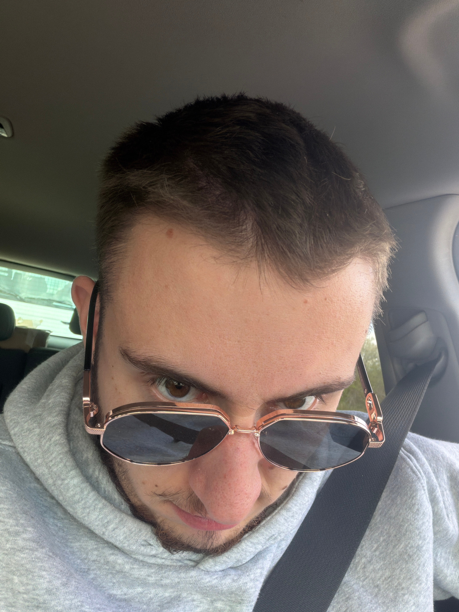 A person is photographed from a low angle while wearing sunglasses and a gray hooded sweatshirt in the interior of a vehicle. A black seatbelt crosses their chest. The location cannot be determined fr…read more