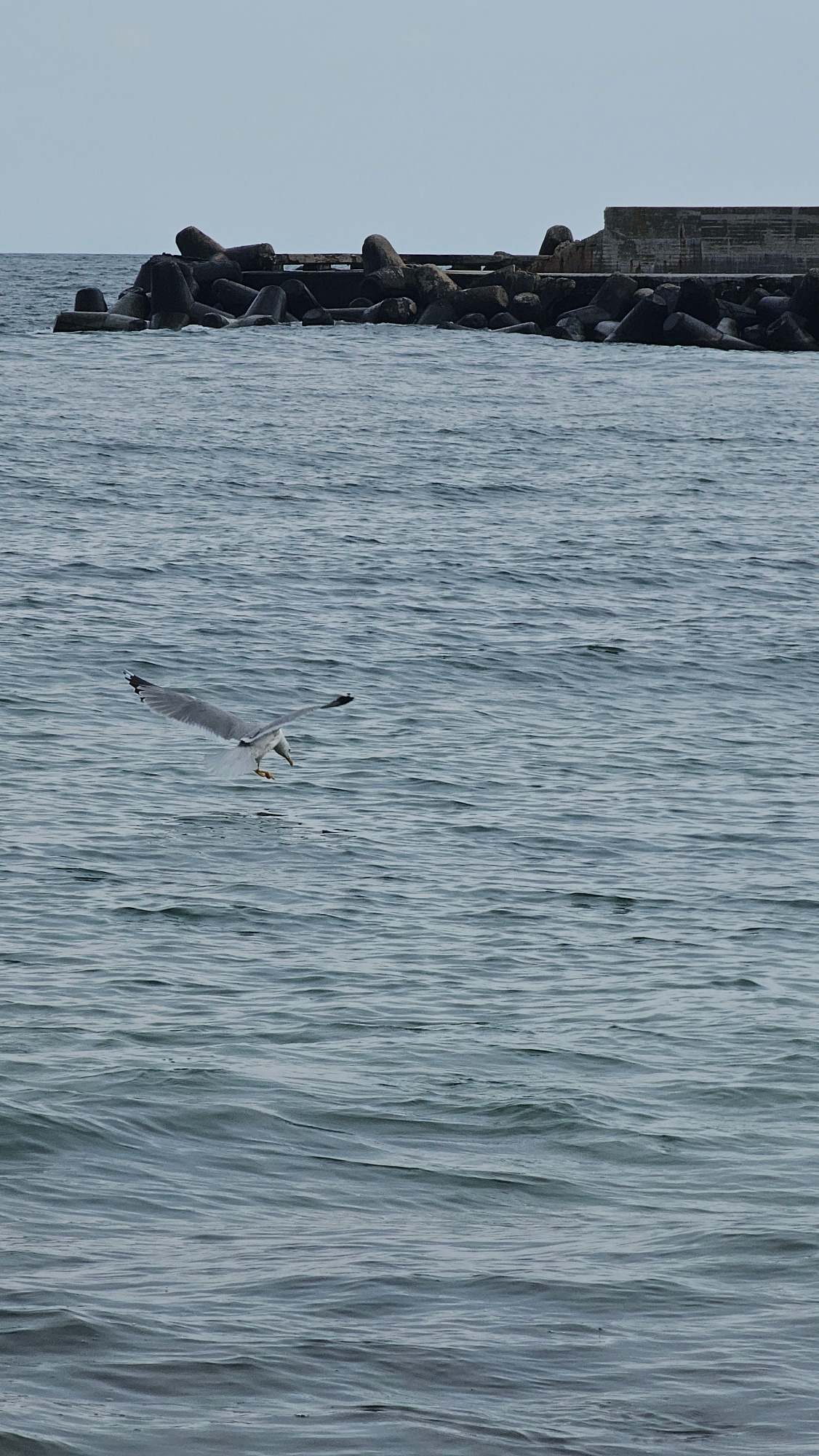 A seagull is diving towards the water in Varna, Bulgaria, off the coast near a concrete breakwater made of tetrapods. The water has a slight texture from wind or waves, and the sky is overcast.
