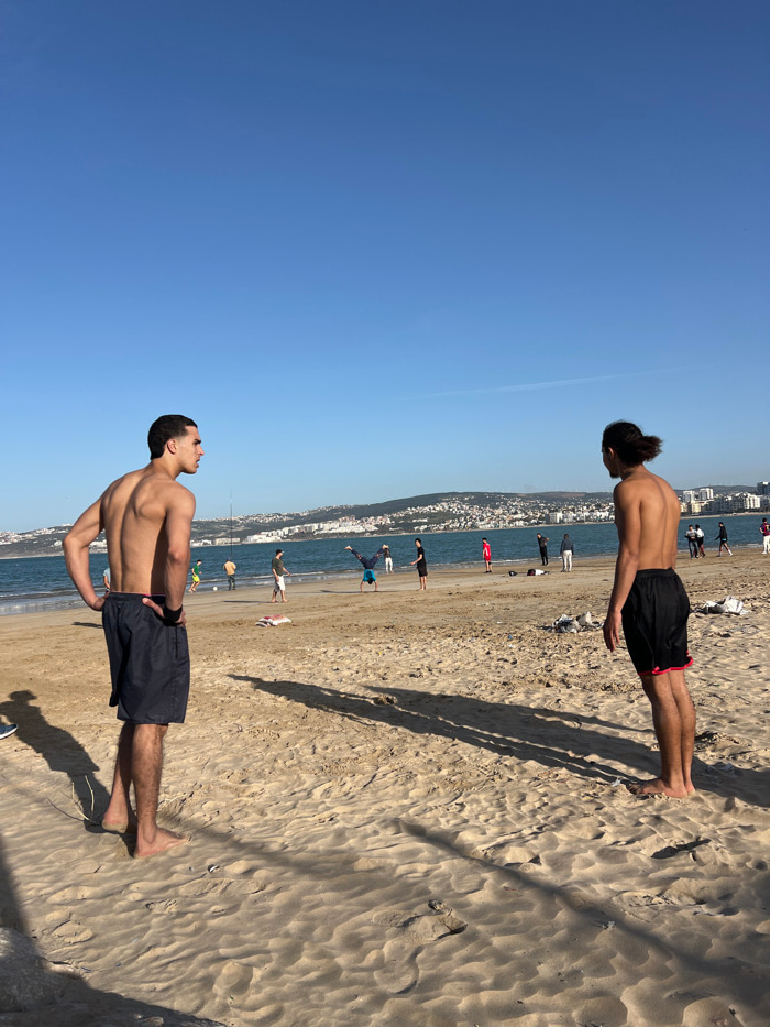 The image depicts a sunlit beach scene in Tangier, Morocco. In the immediate foreground, two bare-chested males stand on light brown sand, their backs partially turned towards the viewer. The individu…read more