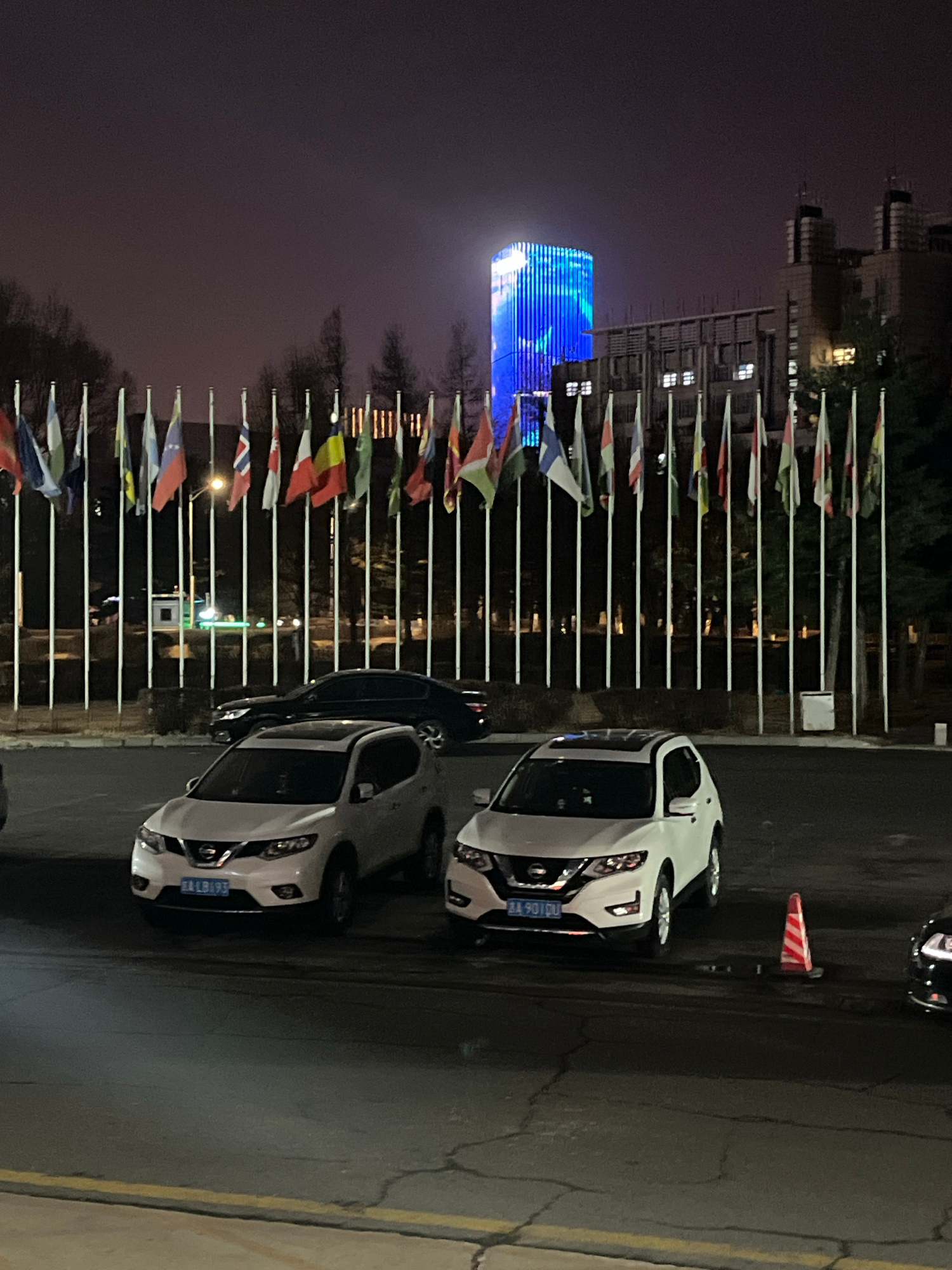 At night in Changchun City, China, numerous flags are displayed on flagpoles. A building is lit up with blue lights in the background. Two white cars are parked nearby on a paved surface. A traffic co…read more