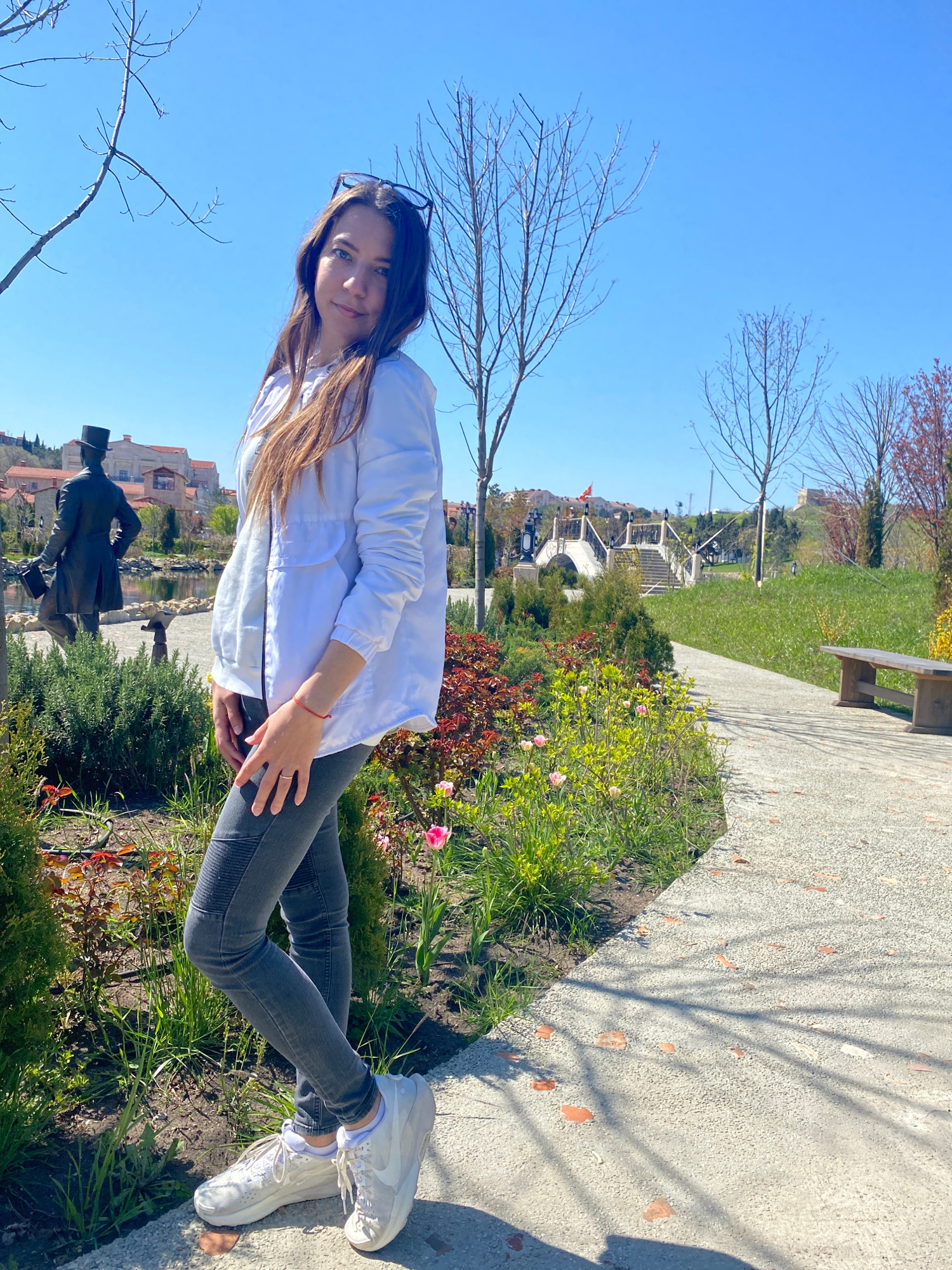 A full-body portrait captures a young woman standing upright in a well-maintained park or garden in Sevastopol, Ukraine, under a clear, bright blue sky. The image is taken on a sunny day, likely in ea…read more