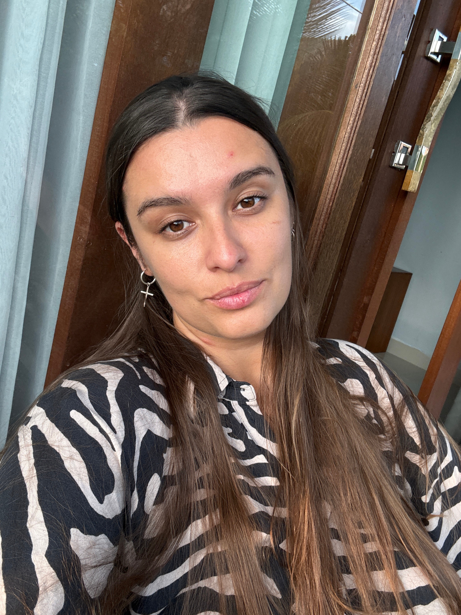 A woman is seen in a close-up selfie shot. She has fair skin, brown eyes, and long, brown hair. She is wearing a zebra-print top. Her earrings feature a circular hoop with a small cross hanging from i…read more