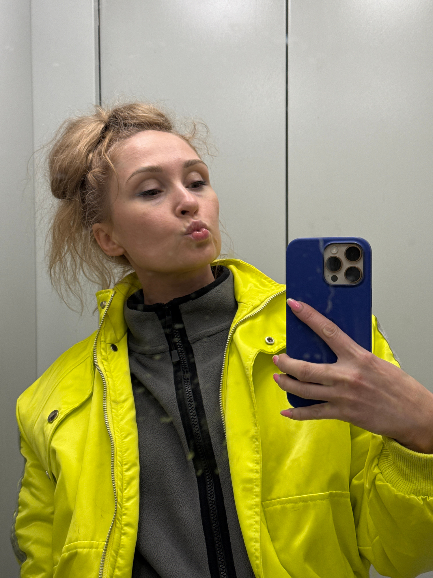 A young woman is depicted in a mirror selfie, holding a blue smartphone with three distinct camera lenses visible on its back. The image is oriented sideways, with the woman's head tilted to the rightβ¦read more