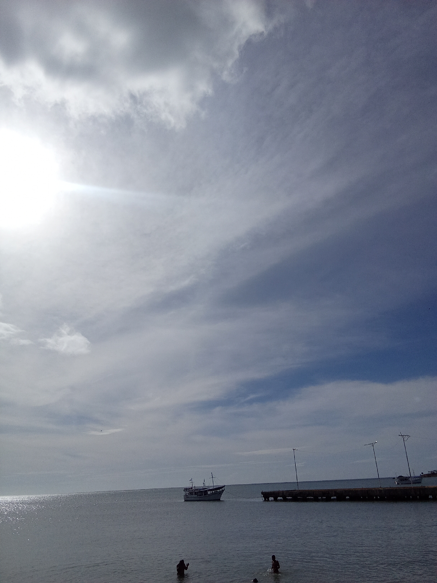The image shows a waterfront scene in Juan Griego, Venezuela. A body of water, likely a bay or ocean, stretches from the foreground to the horizon. Above, the sky is filled with clouds. The sun shines…read more