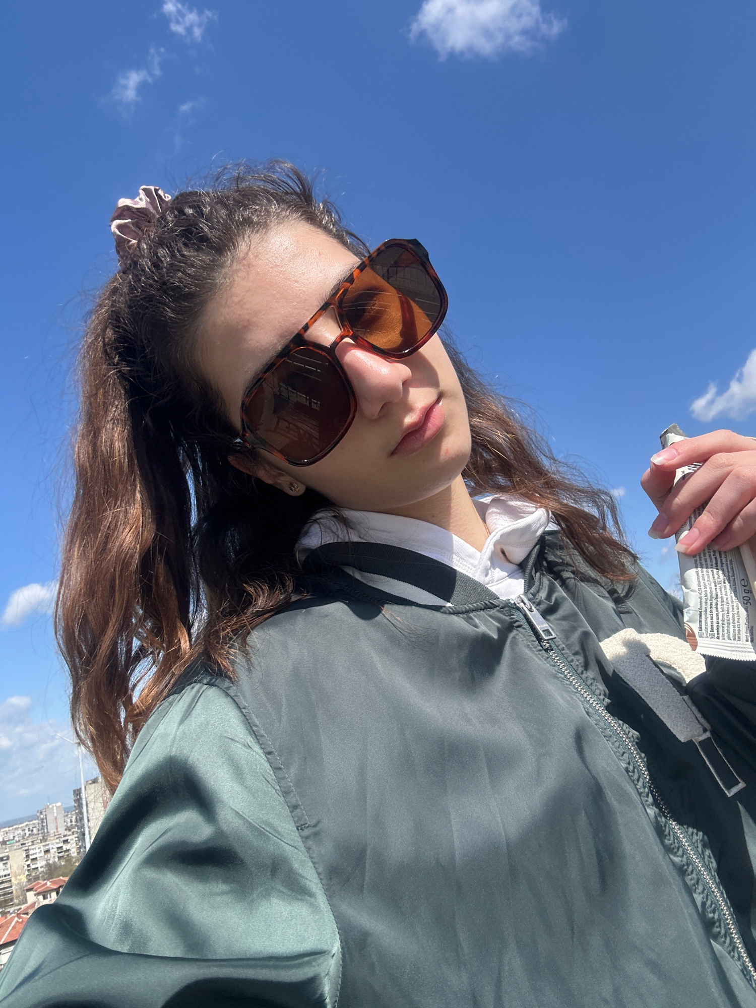 A woman with auburn hair and sunglasses is photographed against a clear blue sky with scattered clouds. She wears a dark green jacket with a white lining, and in her hand, she holds a package with tex…read more