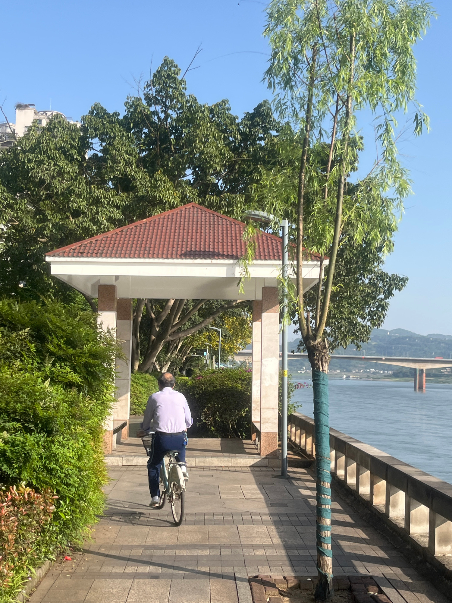 This image depicts a sunny riverside scene in Jiangjin, China, along what appears to be a park pathway or promenade. A man, viewed from behind, is cycling on a light-colored bicycle along the paved pa…read more