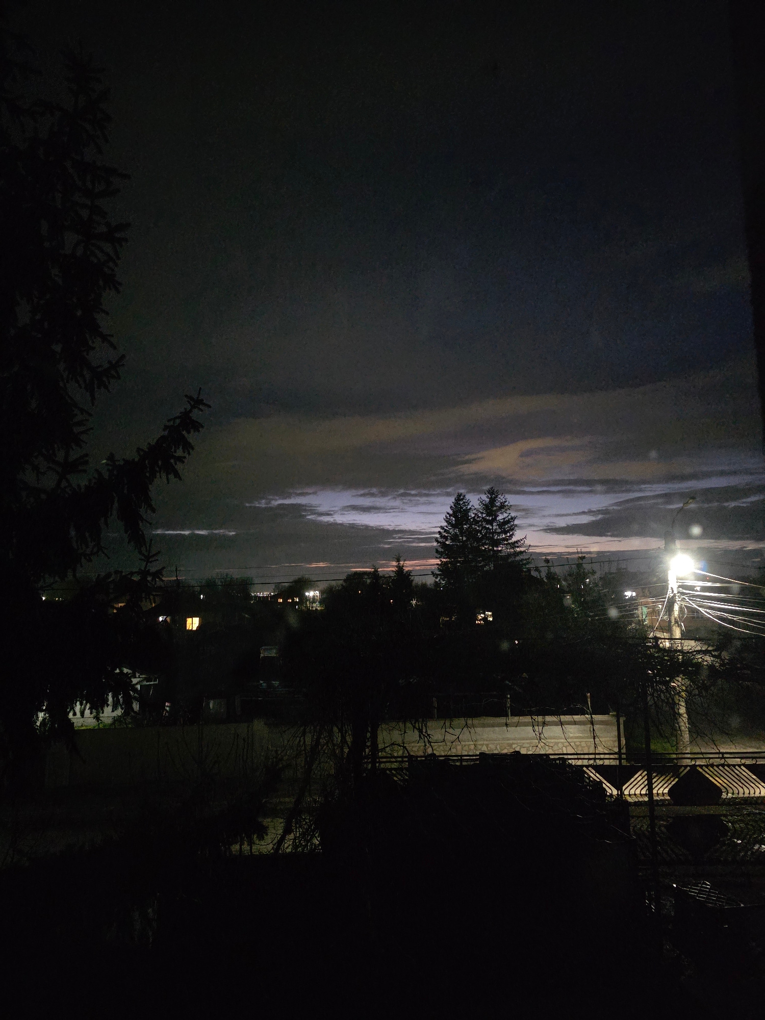 This is a dark, low-light image of a night scene. The left side of the image shows the sky with a blend of dark and lighter tones, suggesting clouds at twilight. The right side is dominated by darknes…read more