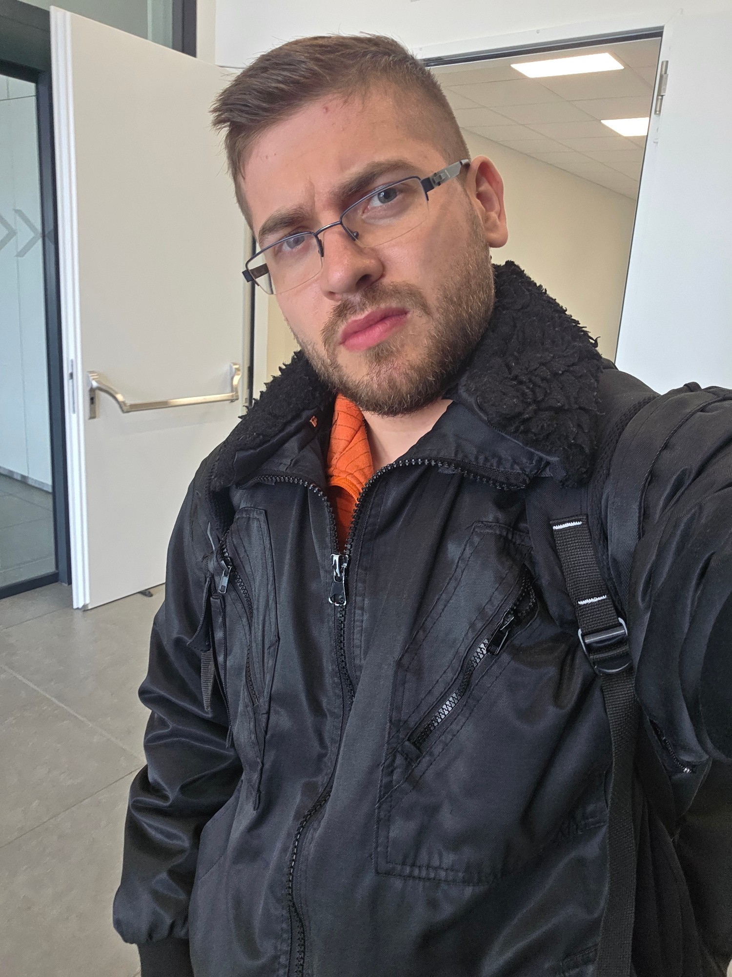 A close-up, rotated portrait captures a young to middle-aged man looking directly into the camera with a neutral expression. He has short brown hair, a neatly trimmed short beard, and wears dark, rect…read more