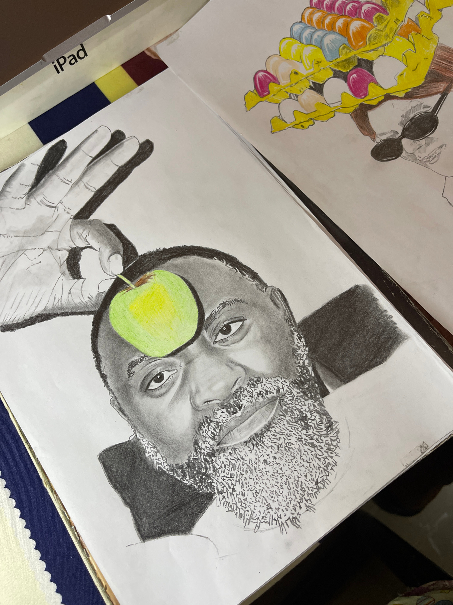 A sketchbook is open, displaying two drawings. The drawing on the right page depicts a man with a full beard, drawn in grayscale. He is holding a green and yellow apple in front of his face. The man h…read more
