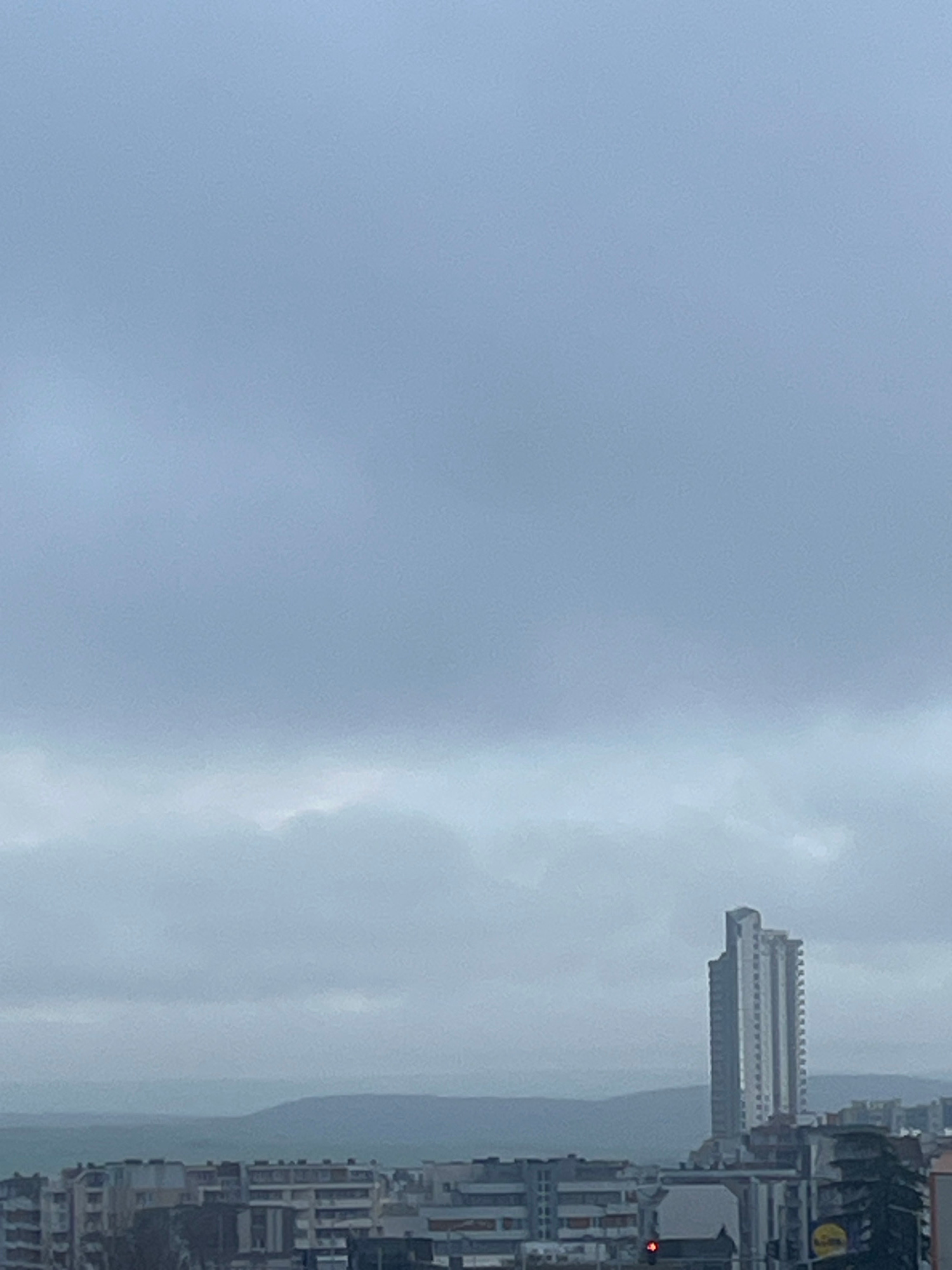 The image shows a cloudy cityscape in Burgas, Bulgaria. Tall buildings line the right side of the frame. To the left of the buildings is a stretch of water. Most of the frame is filled with a gray, ov…read more