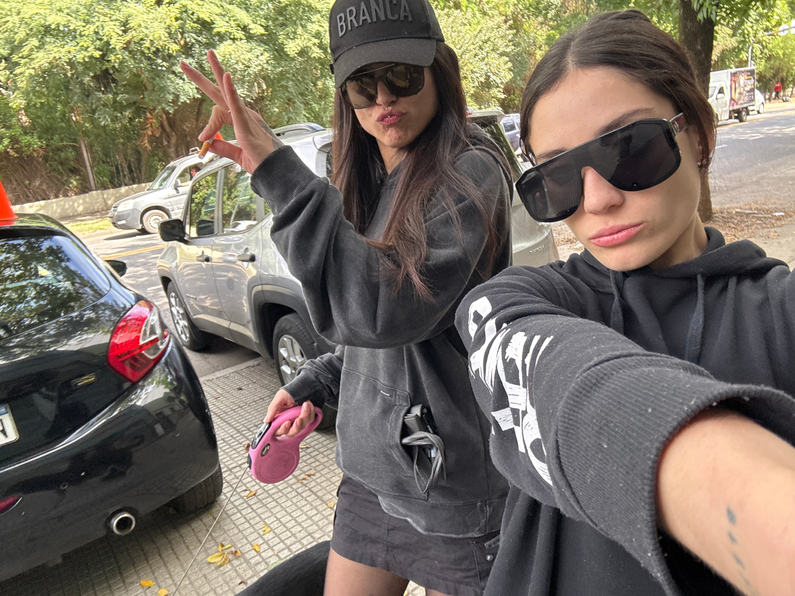 Two young women are posing for a selfie on a city street in Buenos Aires, Argentina. The woman on the left is wearing a black baseball cap with the word "BRANCA" on it, sunglasses, and a grey hoodie w…read more