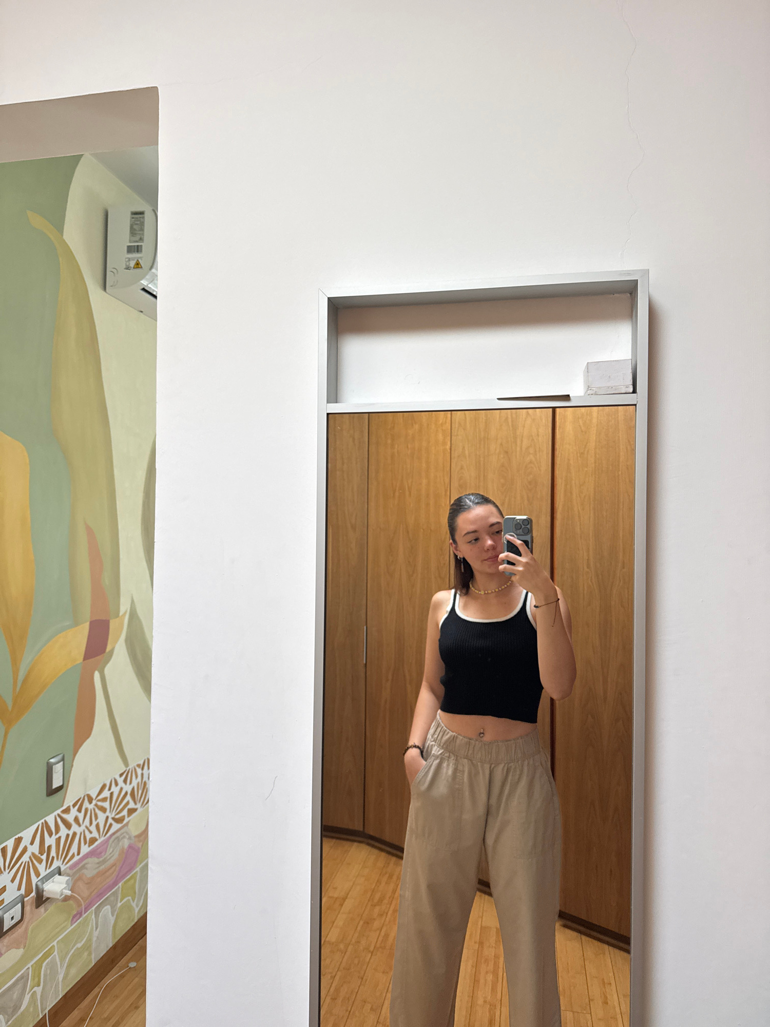 A young woman stands in front of a mirror, taking a selfie with her smartphone. She wears a black tank top with white trim and light beige pants. Her hair is pulled back, and she is wearing a bracelet…read more