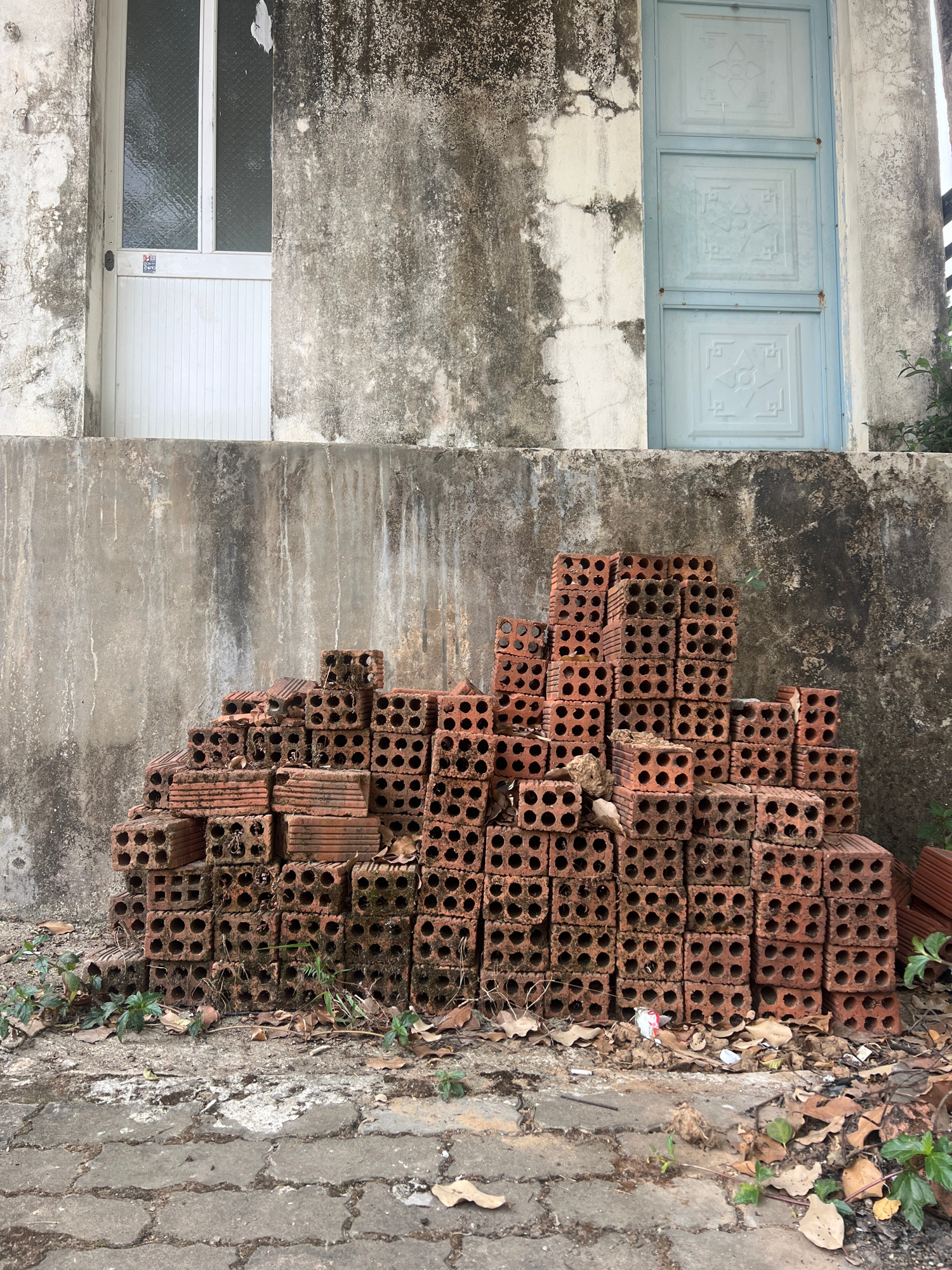 The image presents a vertical view of a building exterior and adjacent walkway, likely in Bờ Y, Vietnam. A stack of red clay bricks occupies a significant portion of the right side, partially overlapp…read more