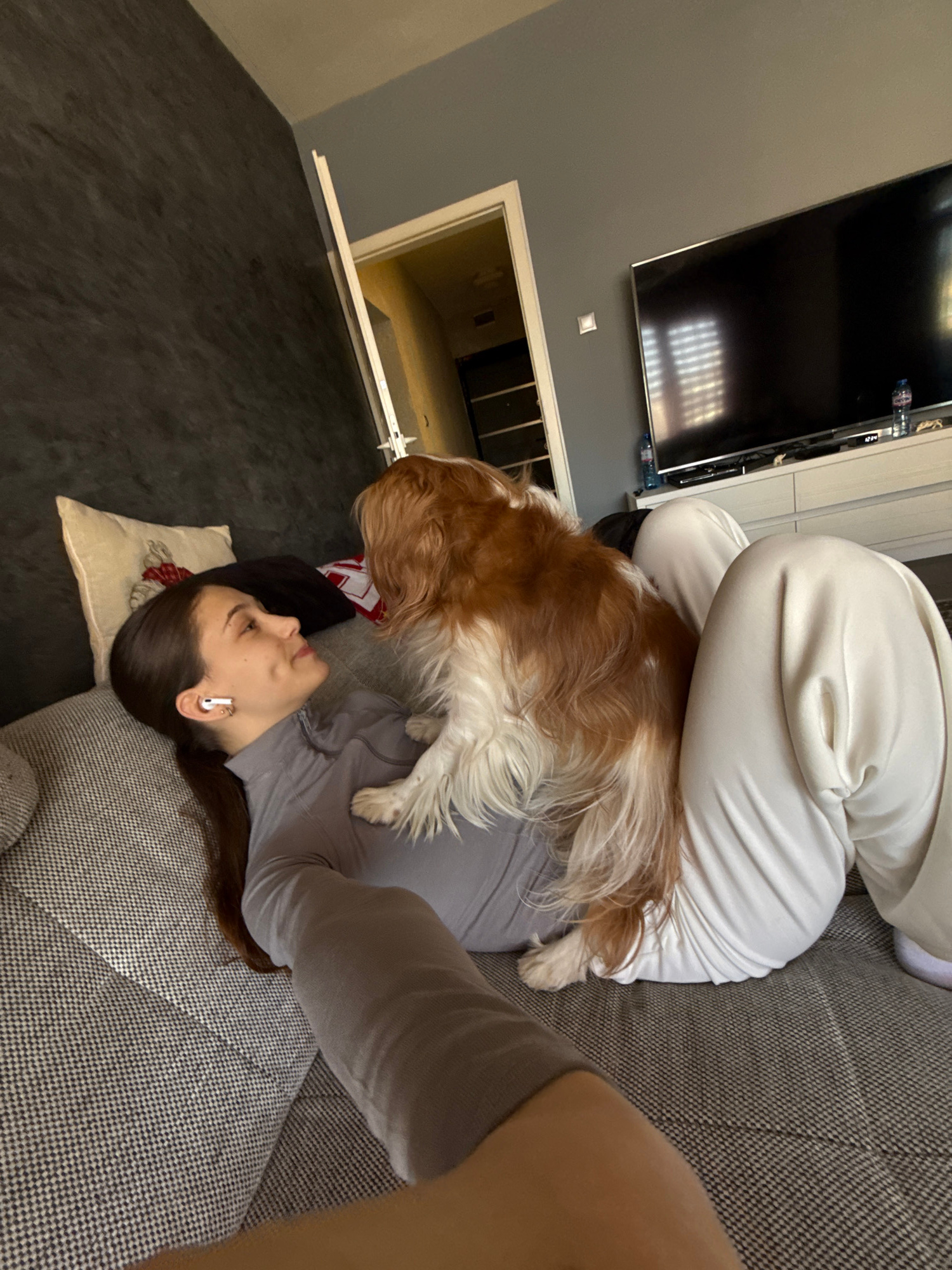 The image depicts a cozy, relaxed indoor scene, likely a living room, in Sofia, Bulgaria. A young woman with long dark hair is lying on her back on a textured gray and white patterned couch, taking a…read more