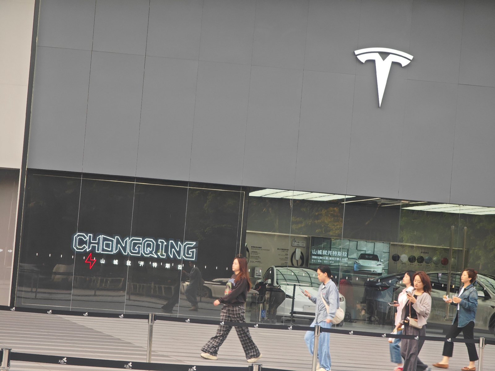The image displays the exterior of a modern Tesla showroom in Chongqing, China, during daylight hours. The building features a minimalist design with a large, dark gray upper facade, prominently adorn…read more
