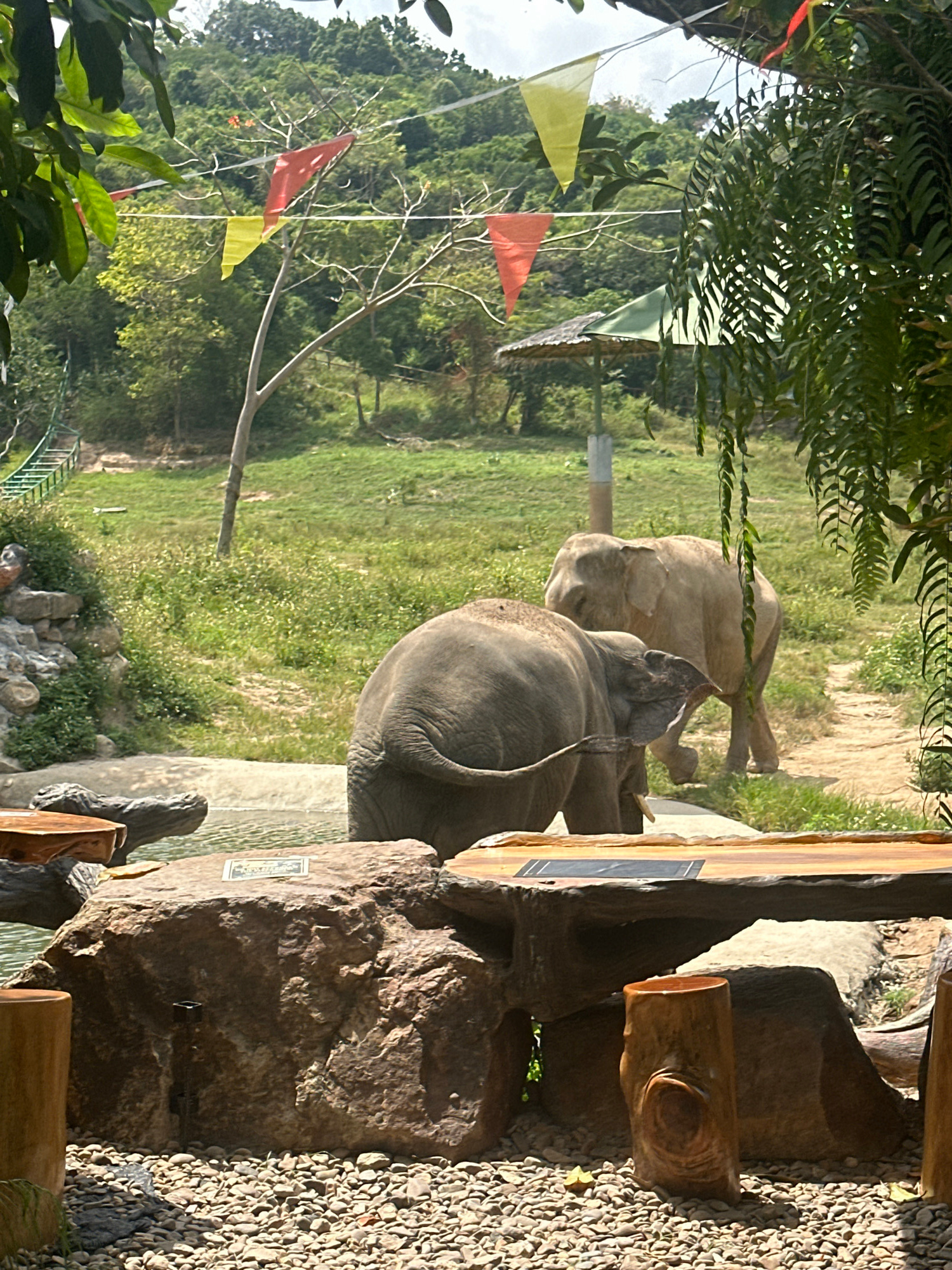The photograph depicts two elephants in an open, grassy area. The larger of the two elephants is closer to the viewer and faces away, its tail prominently displayed. The second elephant is further inβ¦read more