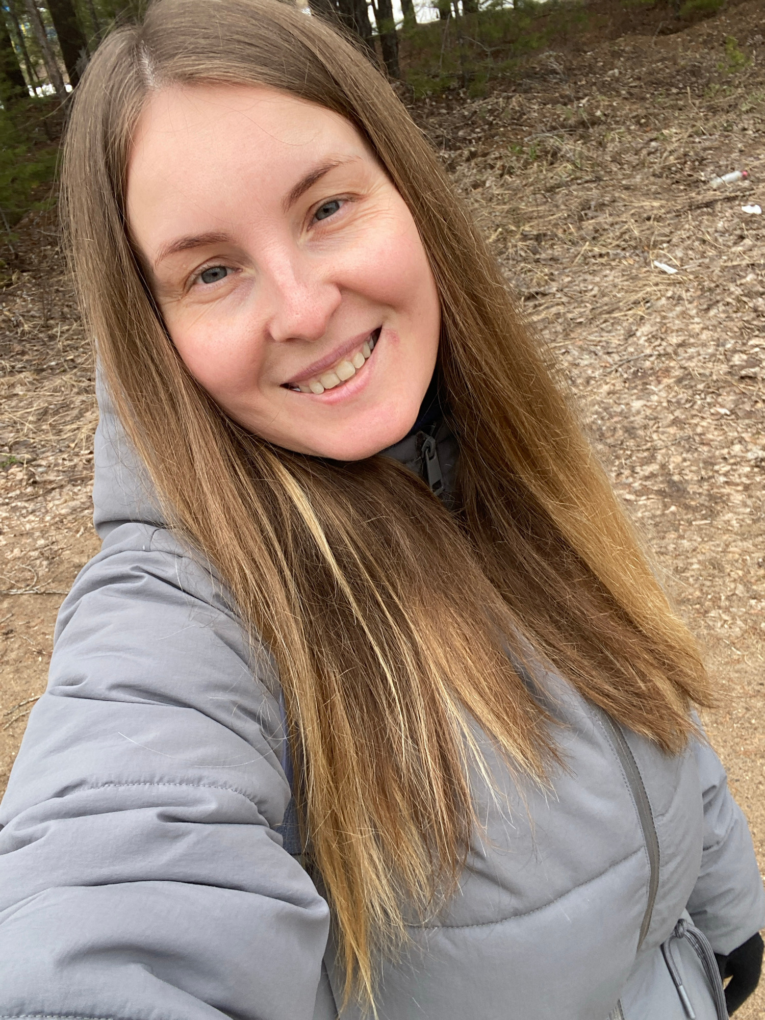 A woman smiles at the camera while wearing a gray jacket. The background appears to be an outdoor location with dry leaves and sparse trees, suggestive of a park or wooded area. The location is not id…read more