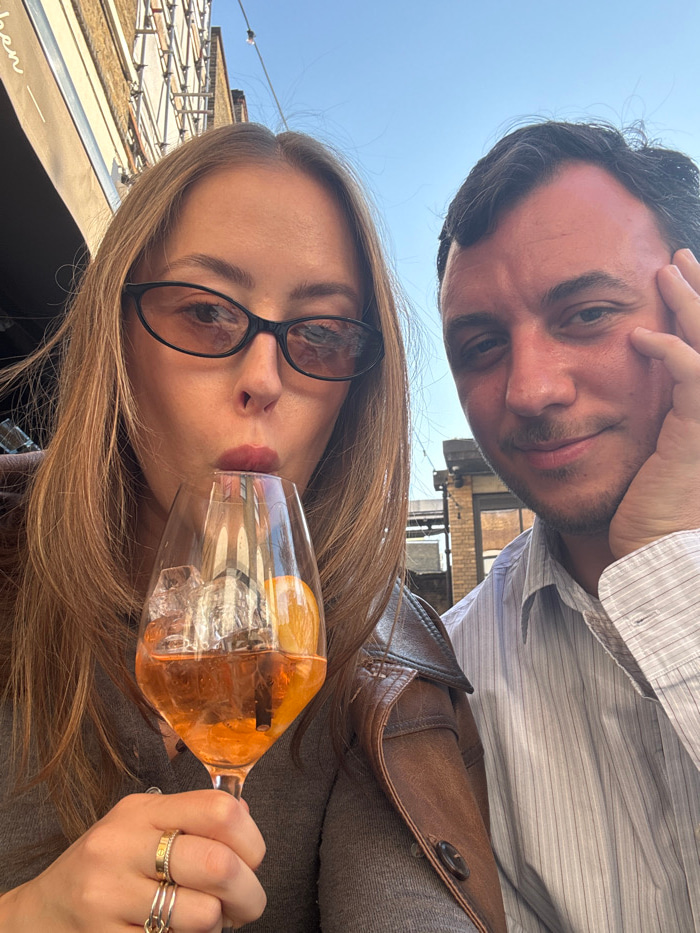 Two individuals are depicted in a close-up outdoor shot under a clear blue sky. A female, positioned on the left, has long, light brown hair and wears black-framed oval glasses with tinted lenses. She…read more