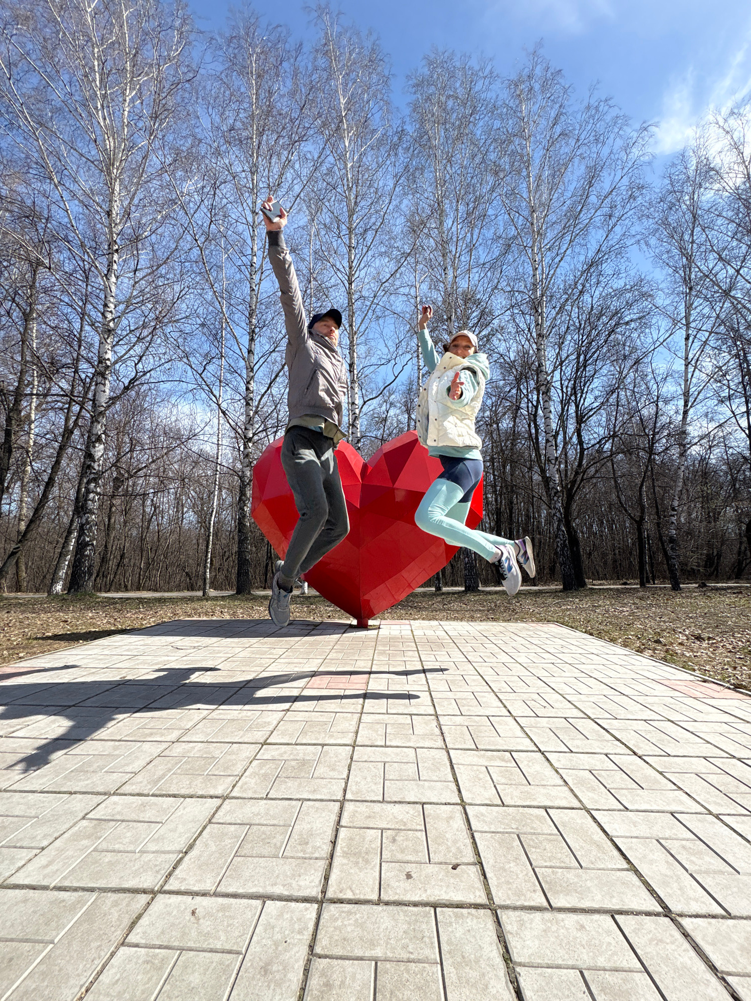 This image captures a playful outdoor scene featuring two people, a man and a woman, posed as if floating in mid-air next to a large, red, geometric heart sculpture. The photo is set in what appears t…read more
