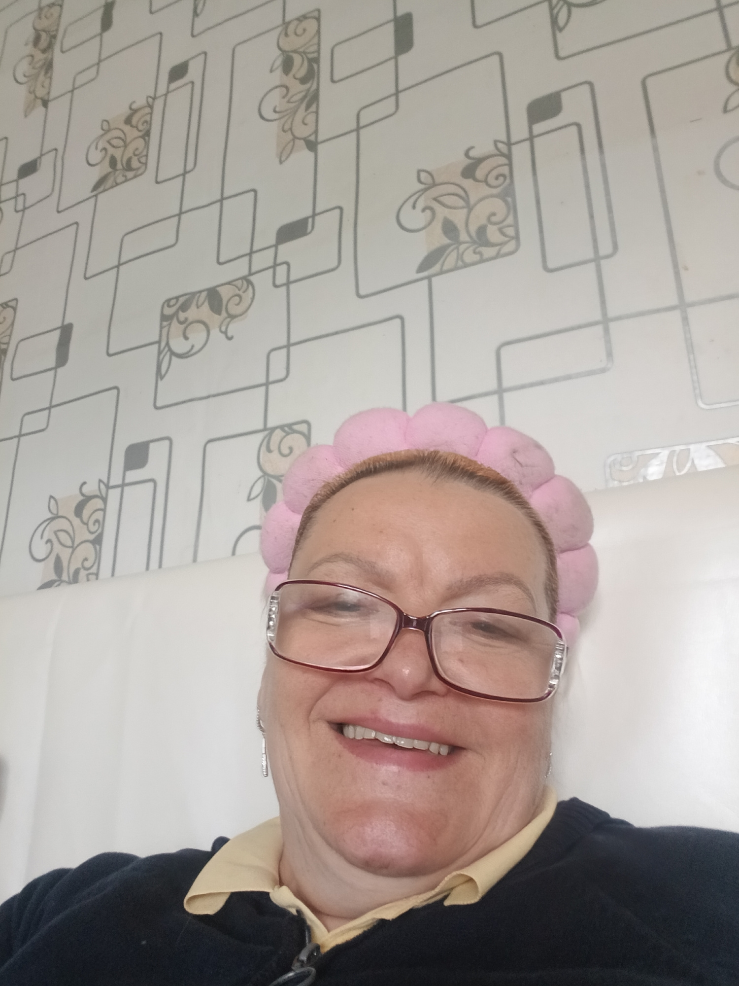The image shows a selfie of a woman with reddish hair wearing a pink fluffy headband and red-rimmed glasses. She is smiling and wearing a dark blue sweater over a yellow collared shirt. Behind her is…read more