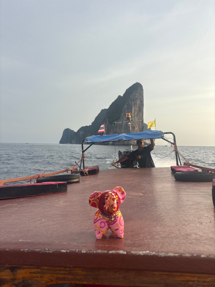 A small, intricately patterned stuffed elephant toy, primarily pink and red with yellow and orange details and a small metallic charm, stands centered on the reddish-brown wooden deck of a moving boat…read more