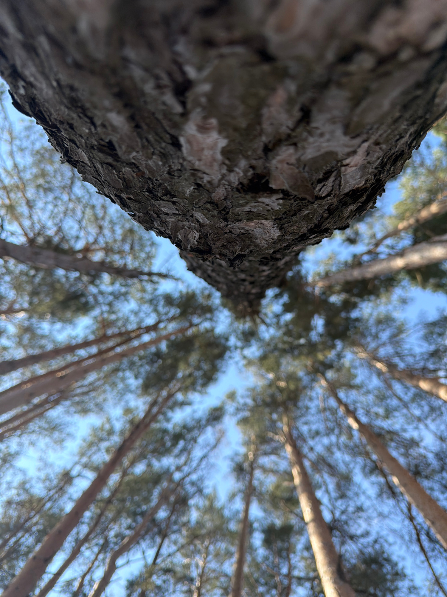 The image displays a low-angle, upward-looking view into a forest, focusing sharply on the rugged bark of a tree trunk against a clear blue sky. A prominent tree, likely a pine or similar conifer, occ…read more